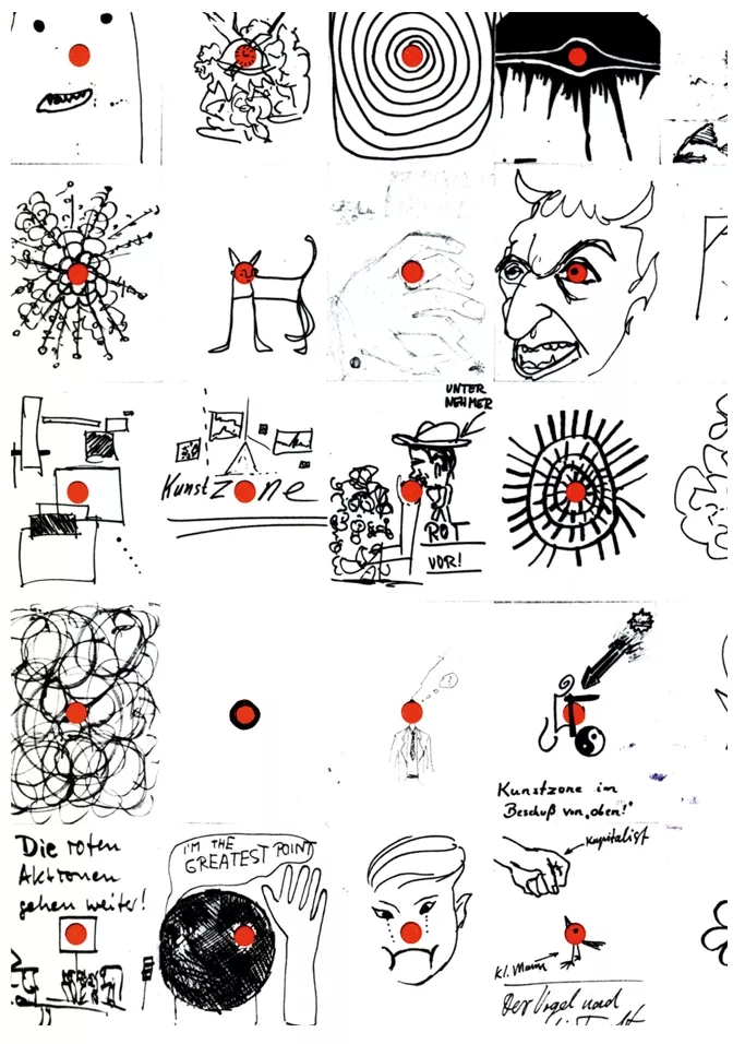 紅點是一種最小干預(yù),展示出白紙的潛力,若沒有紅點,在藝術(shù)展覽的環(huán)境中,沒有人敢做畫并把它釘在墻上。有了紅點,幾乎所有人都感到可以隨意操作,而紅點沒有指示任何特定的形式或含義。