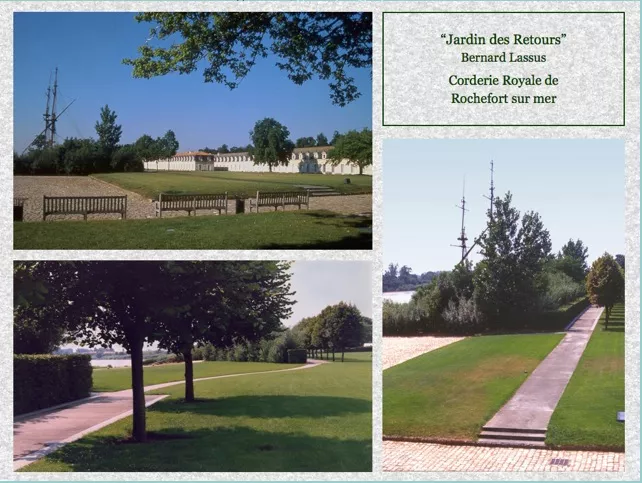 拉素斯對于場地歷史的敏感以及將之與設(shè)計結(jié)合的能力也吸引了其他類型以及尺度的項目。1982年,法國羅什福爾當?shù)卣_展設(shè)計競賽,為翻新的皇家制繩廠周邊提供景觀設(shè)計,重新將城市與這座包含歷史意義的建筑連接在一起。在這個項目中,拉素斯再次運用了創(chuàng)造性分析,意在展現(xiàn)場地的三重歷史——制繩廠時期,被遺棄時期以及現(xiàn)在。為了展現(xiàn)制繩廠時期該場地與法國航海的聯(lián)系和貢獻,拉素斯移除了一些原本的樹木,打開了視野,在視覺上將制繩廠重新和鄰近的夏朗德河聯(lián)系在了一起(圖23-25)。同時還重建了制繩廠后方的老城墻,從而在城墻的平臺上也可以透過植被看到河流,以喚起人們對大西洋和艦隊的回憶。