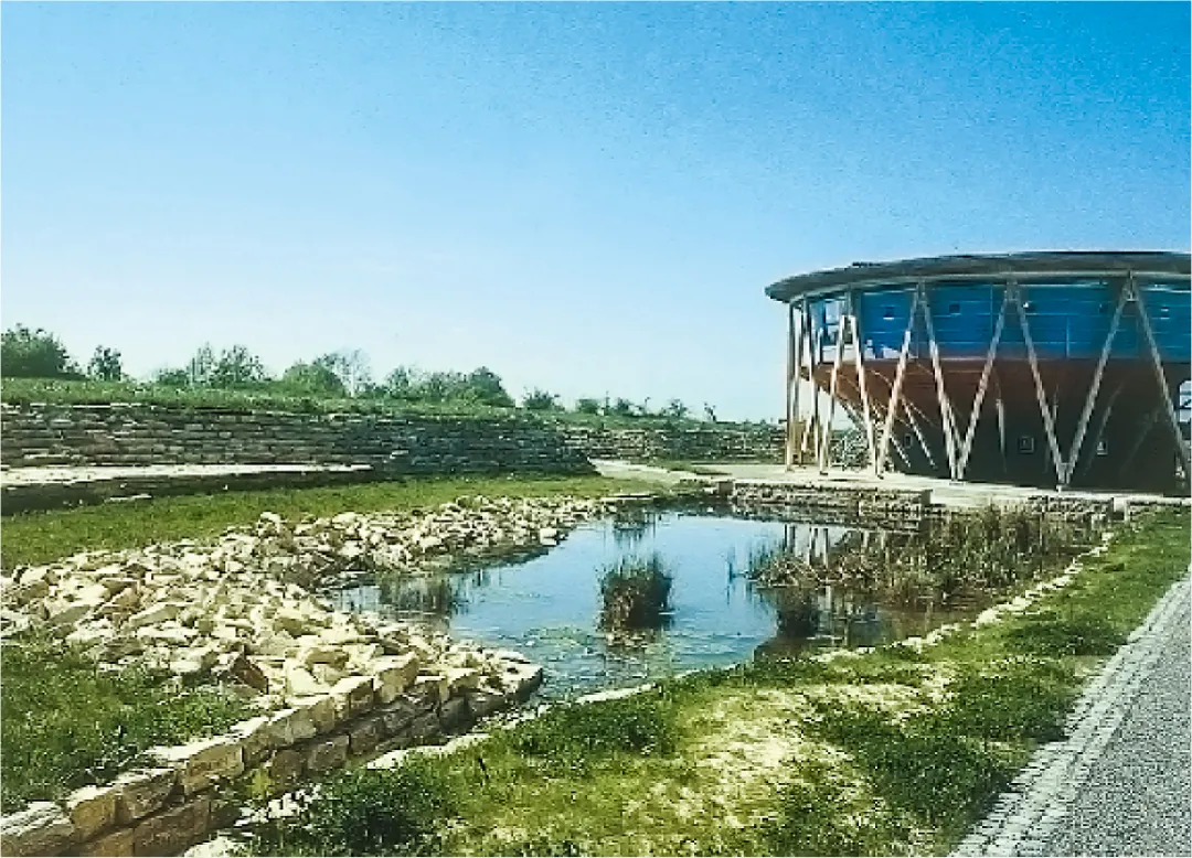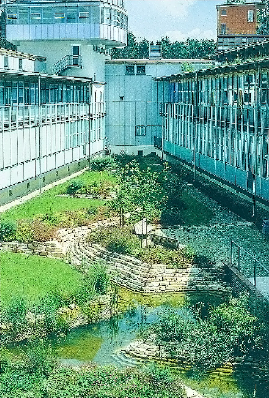 在1988年的學(xué)術(shù)之城烏爾姆(Ulm Science City)項目中,當(dāng)?shù)氐牡湫筒牧鲜規(guī)r被用作擋墻與護(hù)岸的飾面:白色外觀與濕生綠植形成鮮明對比,層疊或錯落的結(jié)構(gòu)則起到美化裝飾作用;堆砌的石灰?guī)r與紅磚溝渠、坑洞、池塘呼應(yīng)了石灰洞與炸彈坑的場所特征,從而喚起了人們對于環(huán)境與歷史的雙重認(rèn)知。這一系列的設(shè)計與地形植被的塑造構(gòu)成了完善的雨水系統(tǒng),進(jìn)一步衍生為錯綜復(fù)雜但科學(xué)合理的生態(tài)廊道。