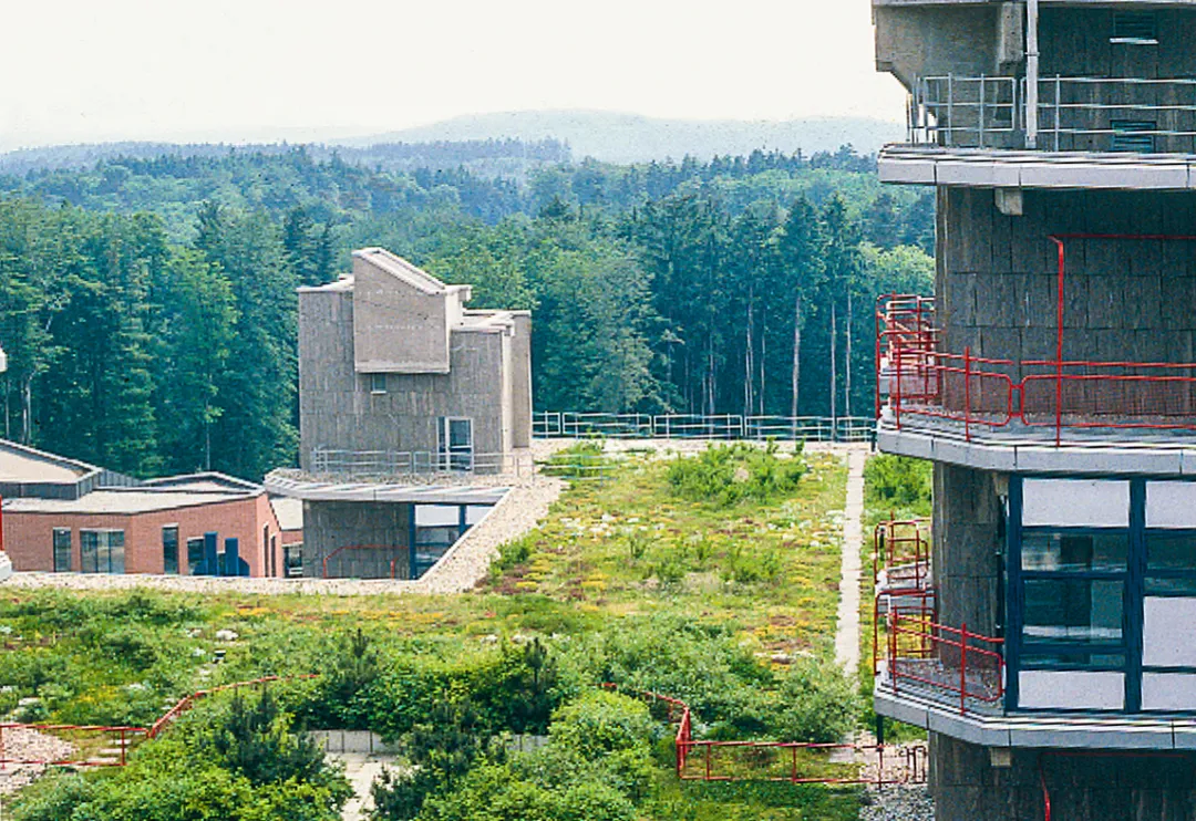 如蘭山丘陵上的馬爾堡大學(xué)(University of Marburg on Lahnberge),是拉茨于1976年獲得的委托項目。除整體的景觀規(guī)劃外,他還精心開發(fā)了屋頂種植系統(tǒng),不僅契合建筑結(jié)構(gòu),也很好地兼顧了灌溉方式與當(dāng)?shù)氐臍夂蛱攸c(diǎn)。細(xì)致安排的植物組合形成豐富的季色變化,塑造出宜人的駐足空間。而屋頂花園產(chǎn)生的隔絕效果,也提升了建筑的能源效益。