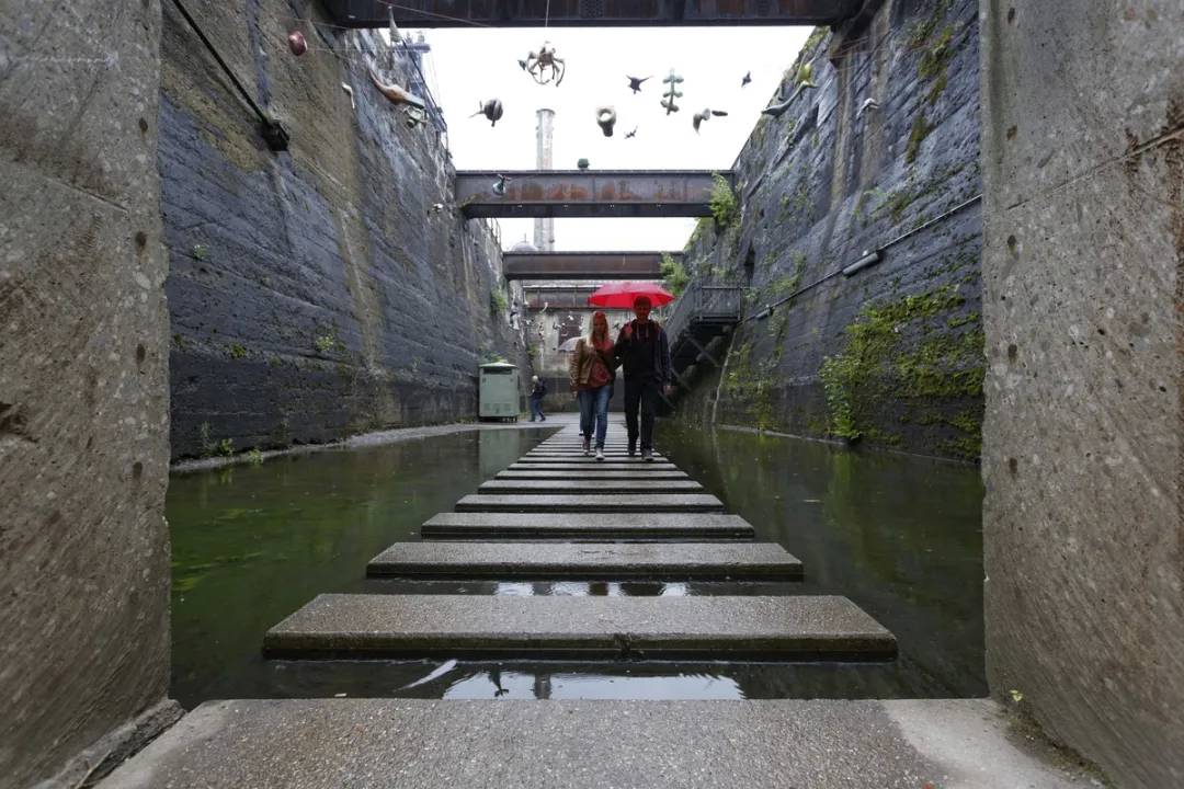 烏多·維拉赫(Udo Weilacher)評價煤氣廠公園龐大的機(jī)械遺跡雖然極富雕塑感,傳達(dá)出另類的美學(xué),但由于孤存于田園牧歌式的環(huán)境中,最終淪為了單純的紀(jì)念物。在杜伊斯堡公園,設(shè)計師則充分利用了工業(yè)的每一寸遺留,將一個過去的事物以及它完整的框架邏輯保存了下來,形成了完備的公園水循環(huán)系統(tǒng)、體驗豐富的散步道系統(tǒng)、結(jié)合原有結(jié)構(gòu)的活動區(qū)和極具特色的鐵路公園和高架步道。