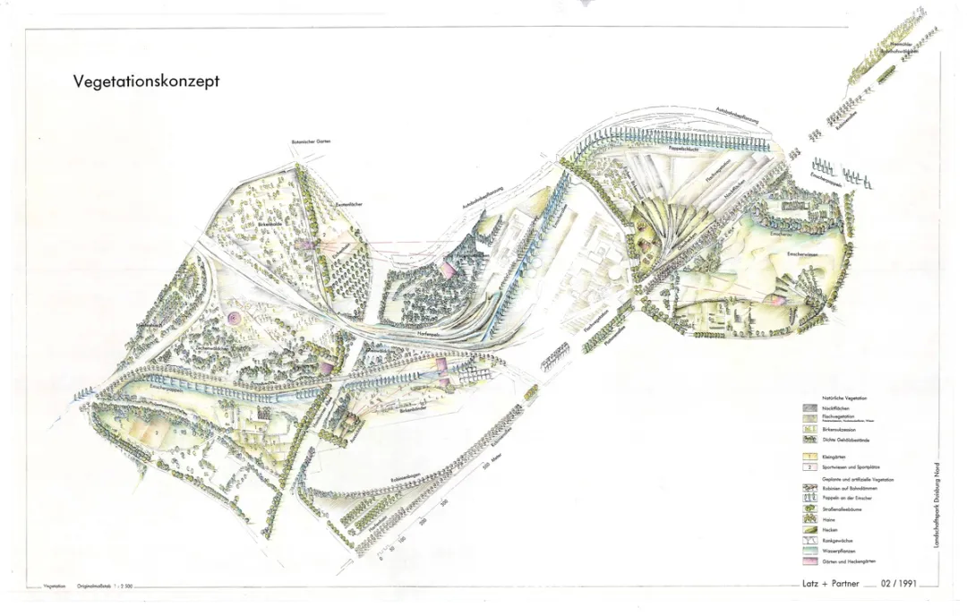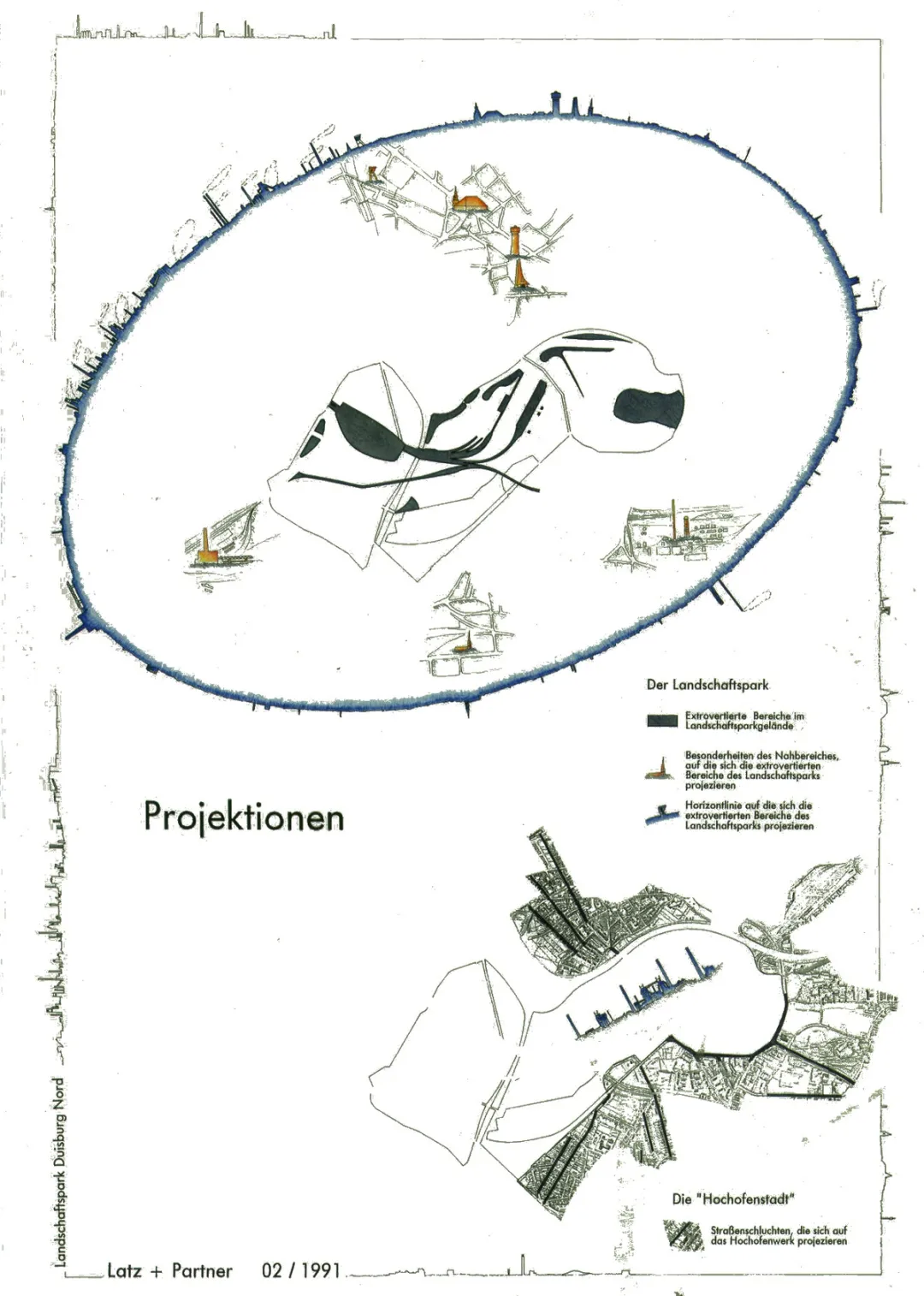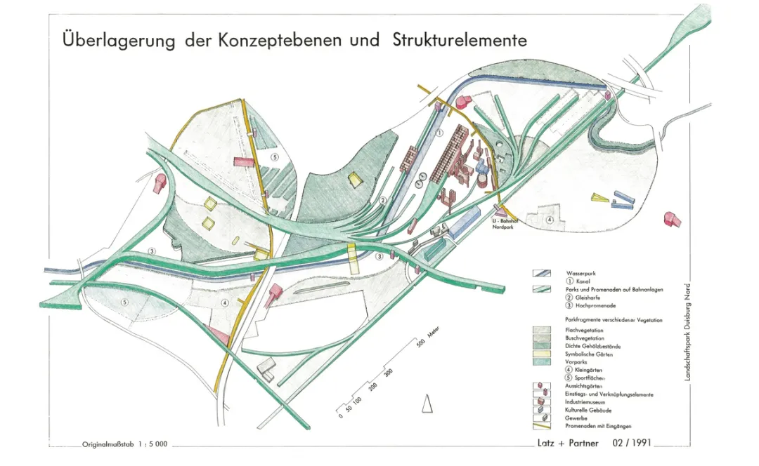 自慕尼黑工業(yè)大學(xué)畢業(yè)后,拉茨在亞琛工業(yè)大學(xué)(RWTH Aachen University)學(xué)習(xí)生態(tài)知識與城市改造。時值德國產(chǎn)業(yè)結(jié)構(gòu)轉(zhuǎn)型,工廠關(guān)閉、棕地棄置,他接觸了大量魯爾區(qū)的改造課題。而當(dāng)時,結(jié)構(gòu)主義學(xué)派也正逐漸盛行于歐洲學(xué)術(shù)界。這一學(xué)派的主要觀點(diǎn)“任意社會文化經(jīng)驗的背后都有著一組關(guān)鍵性的結(jié)構(gòu)系統(tǒng)支撐其意義的構(gòu)成”,該思想與拉茨的設(shè)計理念不謀而合:景觀的形式、特點(diǎn)、意義的呈現(xiàn),均由其背后相互纏結(jié)、意義豐富的信息結(jié)構(gòu)支撐,因此必須通過對這一信息結(jié)構(gòu)系統(tǒng)性的掌握、解析,并用符合其詮釋邏輯的方法進(jìn)行重構(gòu)。