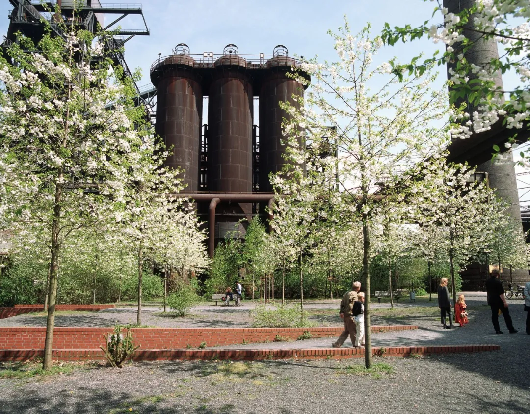 此外,在北杜伊斯堡公園(Landschaftspark Duisburg Nord)中,考伯廣場(Cowper Platz)前盛開的櫻桃矩陣亦是拉茨植物栽培思想的絕佳體現(xiàn)。粗獷的工業(yè)美感與細(xì)密柔和的自然對比形成了令人難忘的風(fēng)景,櫻桃樹中搖曳的果子似乎也在呼應(yīng)著拉茨對果樹的情愫。