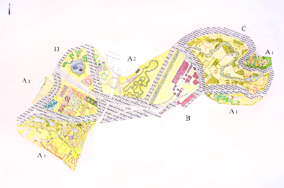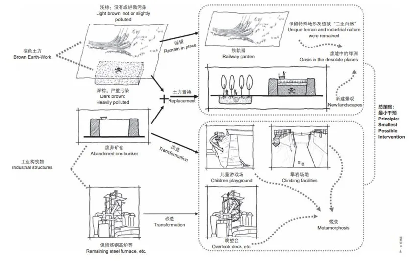 其實,“最小干預(yù)原則”(minimal intervention principle)最早是由法國景觀設(shè)計大師伯納德·拉索斯(Bernard Lassus)與盧修斯·伯克哈特(Lucius Burckhardt)共同構(gòu)建的。有趣的是,拉索斯也參與了此次競標(biāo),他從該地區(qū)不斷流失的人口問題出發(fā),擬定設(shè)計主題為“前天、昨天、今天、明天”(The day before yesterday, yesterday, today and tomorrow),以前工業(yè)、工業(yè)、當(dāng)下、未來劃分為不同區(qū)域,期望將人們的日常休閑時間延伸至公園中。
