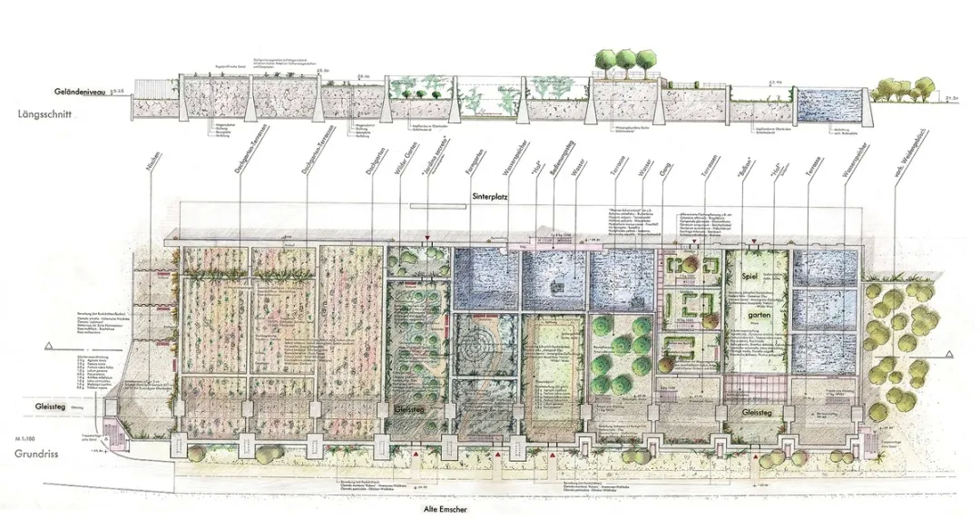 于是,斷壁殘垣、碎石瓦礫、工業(yè)廢料、鐵軌礦渣瞬間從廢棄物轉(zhuǎn)變?yōu)楸A粲洃?、體現(xiàn)特色、提升認(rèn)同的改造物料,并成為當(dāng)?shù)馗黝惾巳盒蓍e活動的場所。因此,評審團(tuán)主席多娜拉·維倫登(Donata Valentien)曾說,拉索斯的方案盡管有著知識上的誘導(dǎo)以及諸多值得強(qiáng)調(diào)的觀點(diǎn),但縱覽其對未來公園的所有暢想后,會發(fā)現(xiàn)只有一個解決方案適合于這片場地,那便是彼得·拉茨的設(shè)計,因其對水、能源與植被都予以了重點(diǎn)關(guān)注,并提出了可靠的設(shè)計策略。