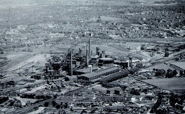 ▼1954年,北杜伊斯堡公園的前身梅德里希鋼鐵廠航拍圖 ? Archiv der Thyssen AG, Duisburg