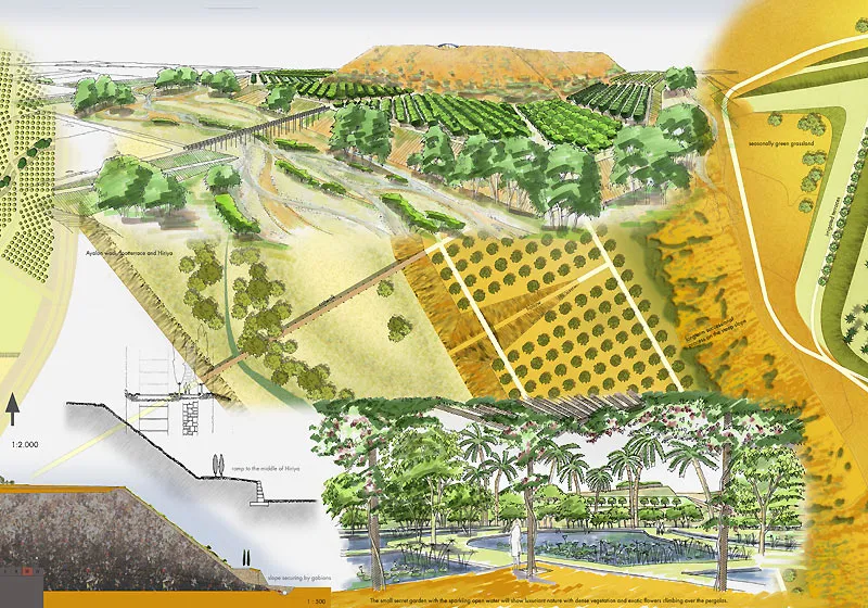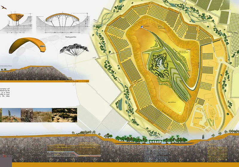 在北杜伊斯堡公園設(shè)計的10年后,拉茨再次操刀了位于特拉維夫(Tel Aviv)的赫利亞山(Hiriya Mountain)的改造。這是一座由垃圾堆成的85m高,占地68hm2的平頂山。拉茨針對這片土地提出“了解產(chǎn)生過程—借助化學(xué)知識理清其內(nèi)部正在發(fā)生的變動—確認(rèn)目前可利用技術(shù)手段”的設(shè)計流程,由此知悉場地的癥結(jié)在于雨水滲透引發(fā)的污染、以及山體滑坡帶來的危害。