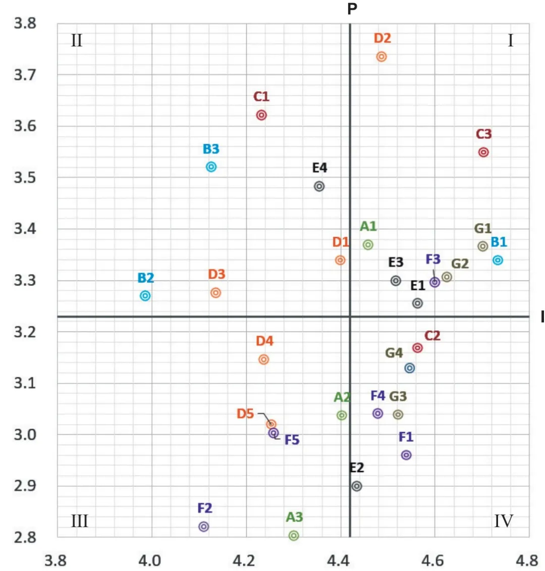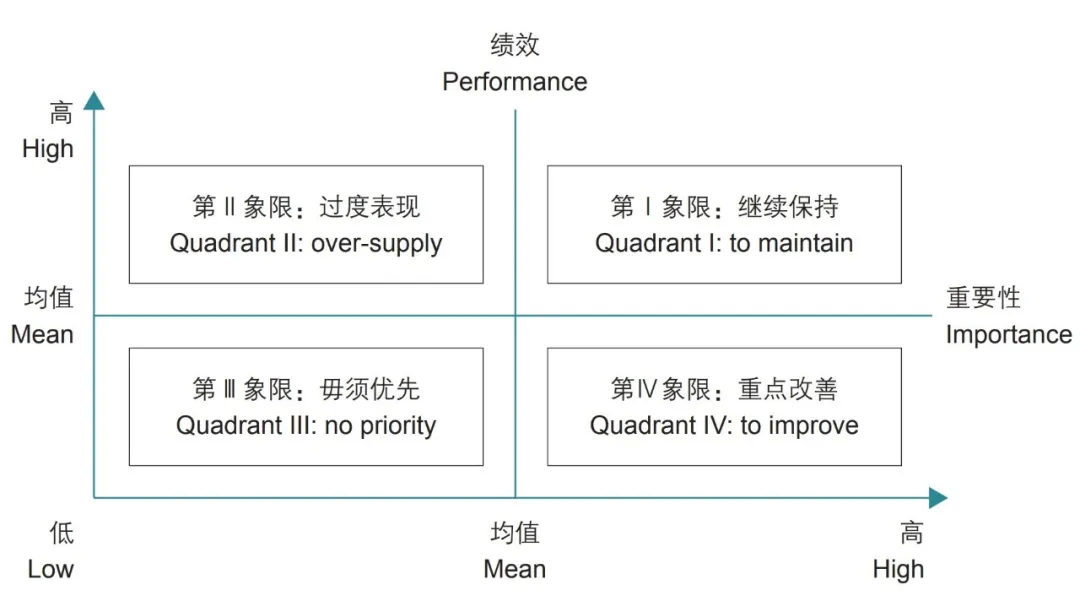 本研究采用重要性-績效分析法(Importance Performance Analysis,簡稱IPA法)分析受訪者的CES評價結(jié)果。IPA法是通過研判使用者對產(chǎn)品/服務(wù)的價值期待與實際表現(xiàn)的關(guān)系,來制定產(chǎn)品/服務(wù)未來發(fā)展策略的分析方法,其最早可追溯到20世紀70年代,由約翰·A·馬爾蒂拉(John A. Martilla)等人提出[10],并在此后廣泛應(yīng)用于旅游策劃[11]、景觀質(zhì)量評價[12]、歷史街區(qū)更新[13]、公共空間活化[14][15]等方面應(yīng)用IPA法進行分析時將建立象限模型,以重要性水平(I)為橫軸,績效水平(P)為縱軸,以I、P的平均值作為X-Y軸的分割點形成4個象限;其中重要性對應(yīng)CES需求,績效對應(yīng)CES供給,以此分析CES的供需關(guān)系。研究著重針對第Ⅳ象限“重點改善”區(qū)的因子展開優(yōu)化策略的制定。