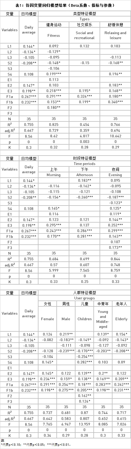 特征模型中,自變量與因變量關系與綜合模型一致,驗證了模型的穩(wěn)定性。部分變量在不同特征模型中展現(xiàn)出的顯著性和影響程度有所差異,可見不同健康活動對各要素的依賴程度和敏感度不盡相同。