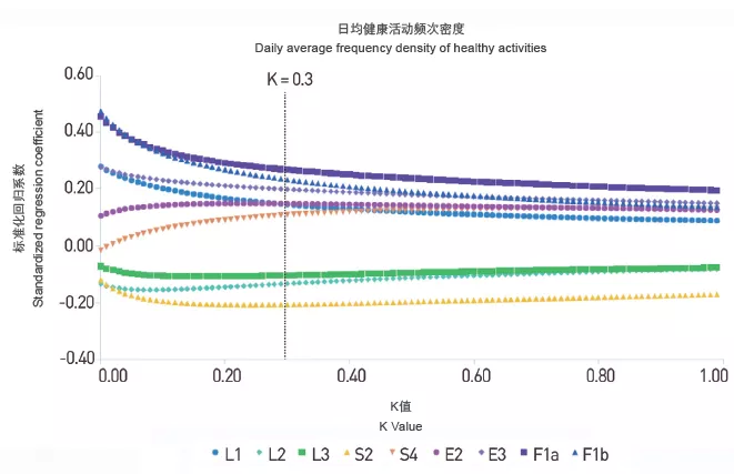 研究對自變量和因變量數(shù)據(jù)進行標準化處理,借助SPSS統(tǒng)計軟件構建綜合模型。由于部分變量存在中等程度的多重共線性(VIF>4),因此選擇嶺回歸進行擬合。經(jīng)過逐步剔除變量,最終變量L1、L2、L3、S2、S4、E2、E3、F1a和F1b得以保留,獲得清晰的嶺跡圖(K=0.3)。