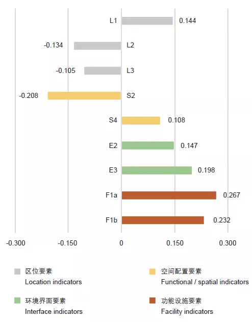 綜合模型的擬合情況較為理想,各變量的解釋力總計75.5%。變量中對日均健康活動頻次密度呈正向影響的要素按照重要程度(Beta系數(shù))依次為F1a(0.267)、F2a(0.232)、E3(0.198)、E2(0.147)、L1(0.144)和S4(0.108);呈現(xiàn)負面效用的要素為S2(-0.208)、L2(-0.134)和L3(-0.105);S1、S3、E1、F2和F3在綜合模型中并未展現(xiàn)出顯著作用,其效用有待通過特征模型進一步細究。