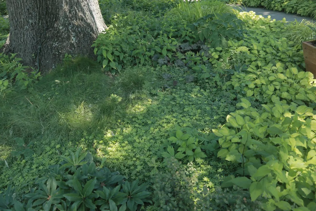 ▼費(fèi)城香克利爾花園中的一處地被種植:車(chē)軸草 (Galium odoratum)和苔草(Carex pensylvanica)組合在多年生植物鐵筷子屬植物(Helleborus spp.)和玉簪屬植物(Hosta spp.)下形成了厚厚的一層地被,有效防止了雜草入侵。? Taro Zheming Cai