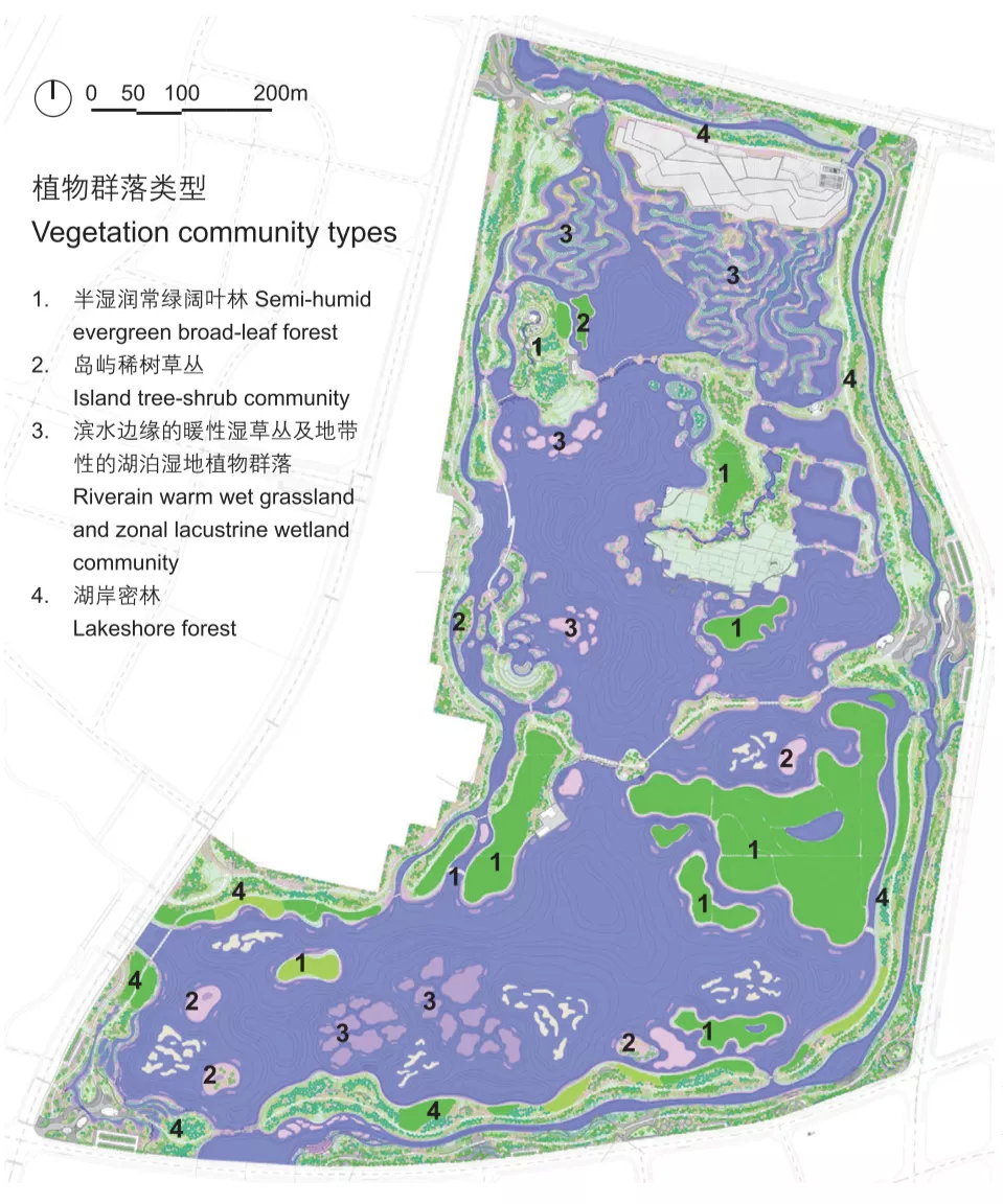 再次,在棲息地的空間布局方面,設(shè)計(jì)模擬自然的湖泊濕地格局,設(shè)置了多樣化的動(dòng)植物生境空間。例如,近岸淺灘生境分布在岸線及島嶼岸線周邊;選擇不規(guī)則的島嶼形態(tài),形成更多樣的島嶼微生境。