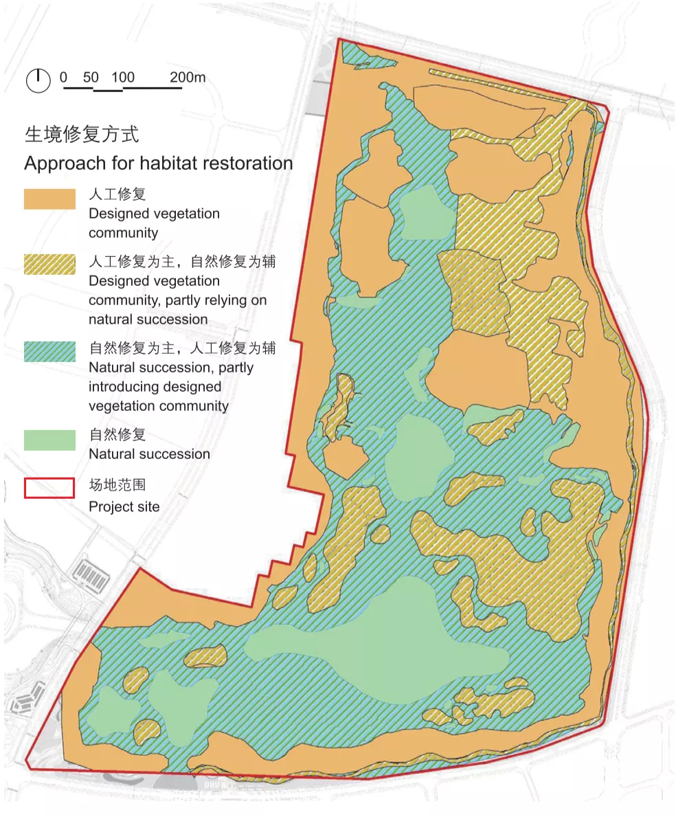 此次設(shè)計(jì)采取了人工修復(fù)和自然修復(fù)相結(jié)合的措施,預(yù)留自然修復(fù)空間,在市民游憩區(qū)域以人工種植為主、自然修復(fù)為輔;在以生態(tài)棲息功能為主的生態(tài)修復(fù)區(qū),則以自然修復(fù)為主、人工種植為輔。