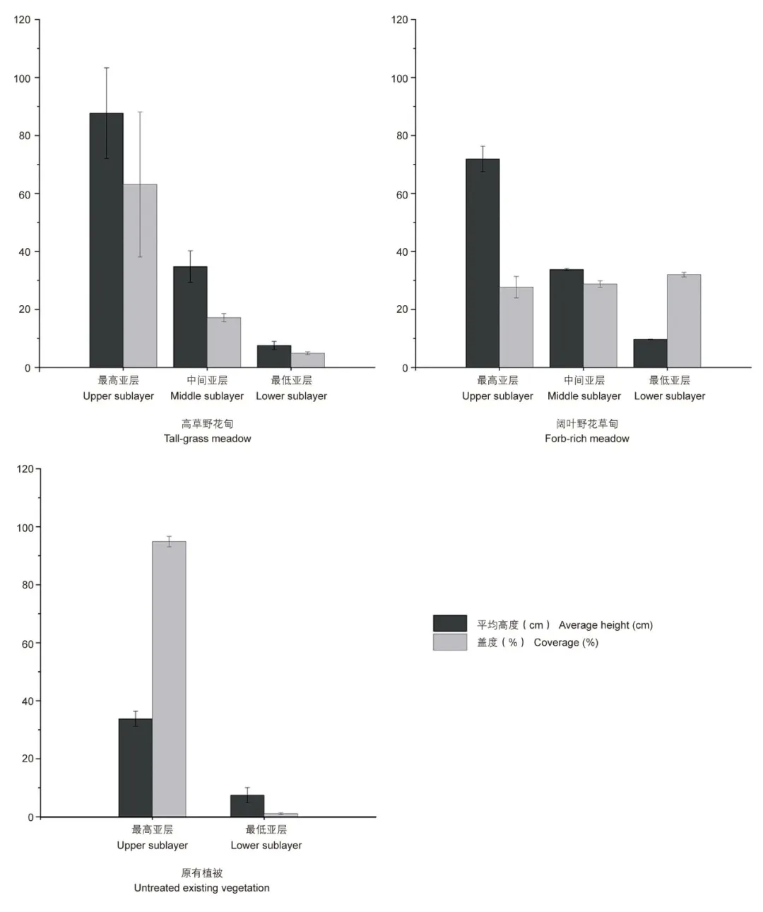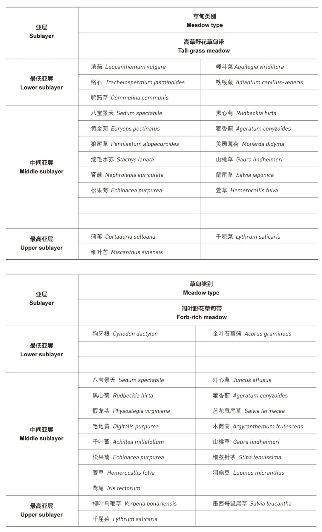 研究提出多層擬自然野花草甸配置方法,通過模擬河岸自然草甸群落的水平格局與垂直結(jié)構(gòu),為高草野花草甸帶與闊葉野花草甸帶分別設(shè)計(jì)種植三個(gè)亞層: