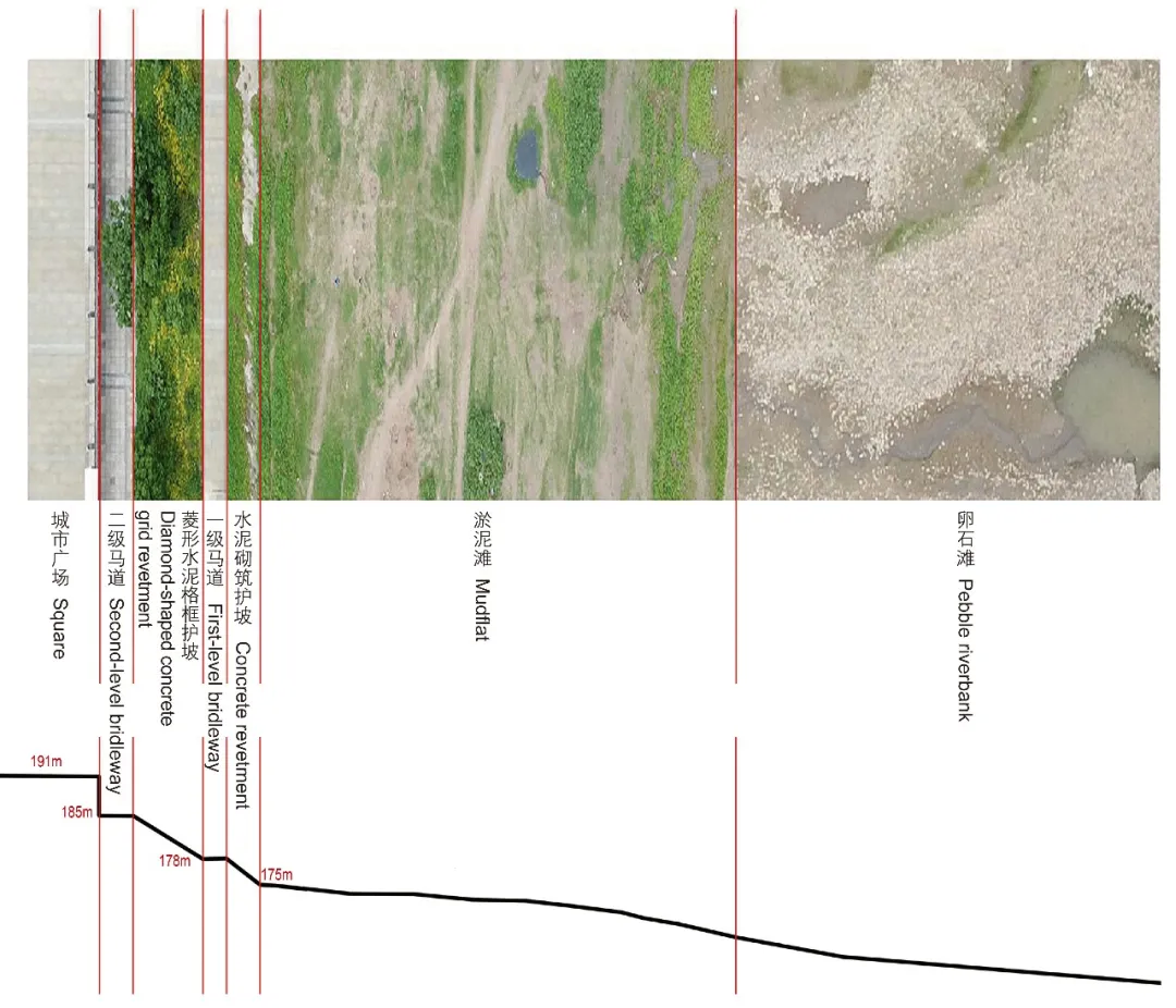 研究區(qū)域位于重慶市主城區(qū)長江干流左岸、九濱路下方的九龍外灘護(hù)岸。場(chǎng)地長約1500m,內(nèi)部人行交通以沿江修建的馬道為主,一級(jí)馬道高程為178m,二級(jí)馬道高程為185m,一、二級(jí)馬道之間由梯步連通,可為游客提供游憩空間。175~178m高程為完全硬化的水泥砌筑岸坡,175m高程以下為以泥沙和卵石為底質(zhì)的河漫灘消落帶區(qū)域。
