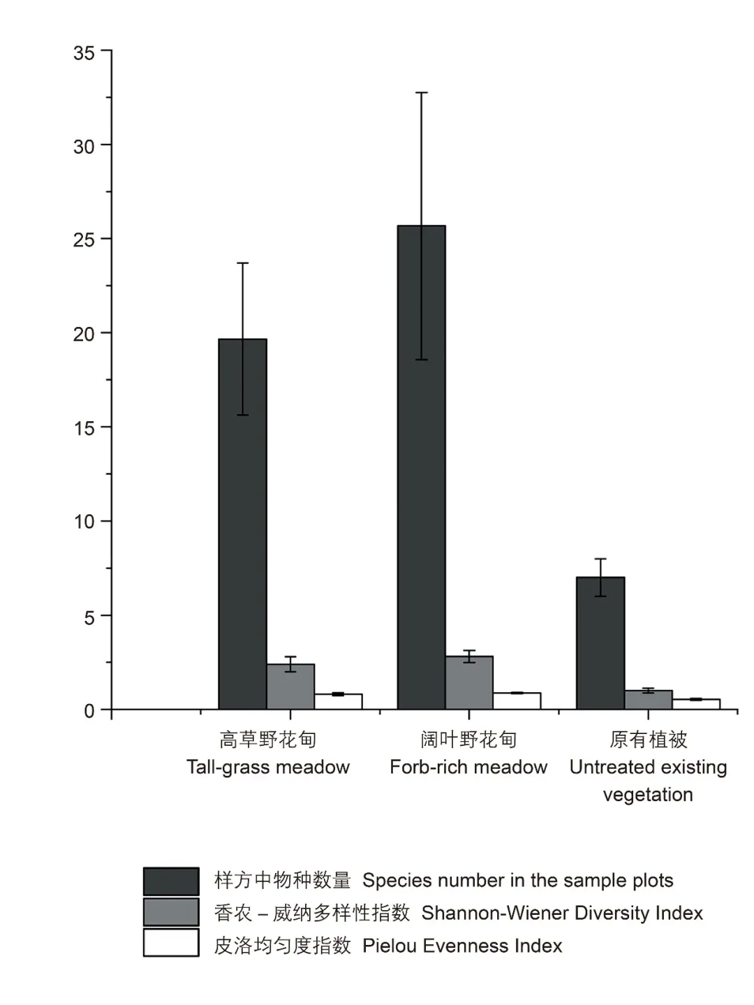 2019年9月,團(tuán)隊(duì)在研究區(qū)域選取高草野花草甸、闊葉野花草甸與原有植被(對(duì)照組)三種草本植物群落開展定量調(diào)查。方差分析表明,高草野花草甸群落與闊葉野花草甸群落的樣方中物種數(shù)量、香農(nóng)-威納(Shannon-Wiener)多樣性指數(shù)及皮洛(Pielou)均勻度指數(shù)顯著高于對(duì)照組植被。結(jié)果顯示,在空間格局上相互嵌套的分帶與分段配置,以及多層擬自然配置技術(shù),建立了對(duì)復(fù)雜山地城市水文條件具有良好適應(yīng)能力的草本植物景觀。