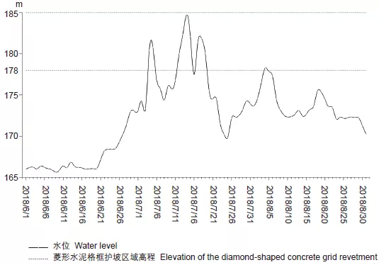 研究根據(jù)高程及歷年夏季洪水水位變化記錄,將護(hù)坡分為三個(gè)斷面:低斷面(178~181m)、中斷面(181~183m)和高斷面(183~185m)。同時(shí),研究以2018年主城區(qū)所受的5年一遇夏季洪水影響為例,依據(jù)6~8月記錄的水位變化發(fā)現(xiàn),