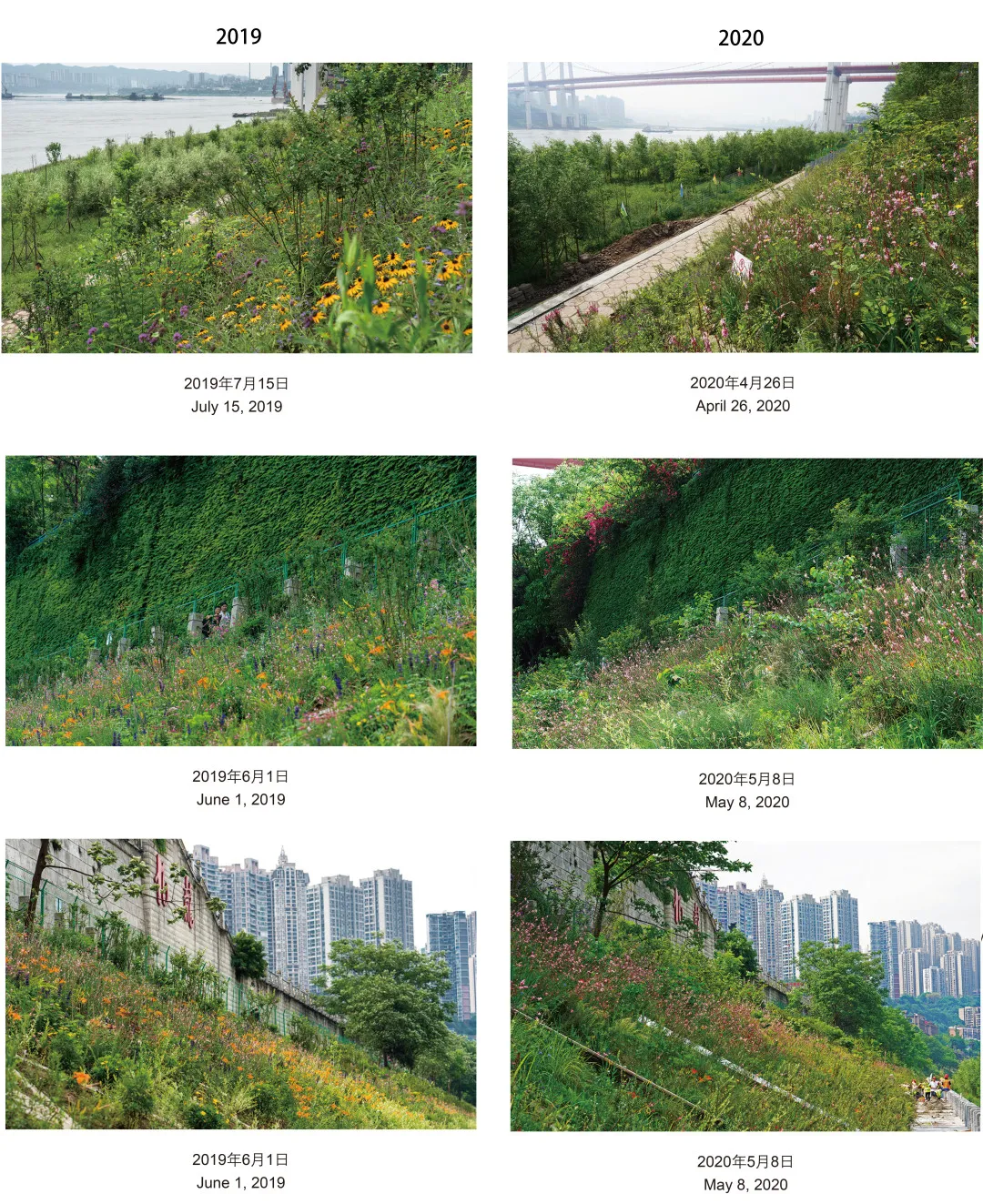 面對(duì)重慶主城區(qū)河岸景觀頻繁遭受的夏季洪水與高溫交替、暴雨徑流沖刷等嚴(yán)酷挑戰(zhàn),九龍外灘護(hù)岸草本植物群落生態(tài)種植實(shí)現(xiàn)了逆境脅迫下山地城市河岸景觀的適應(yīng)性生態(tài)重構(gòu),形成了具備良好自我調(diào)節(jié)及自我修復(fù)能力的韌性景觀。