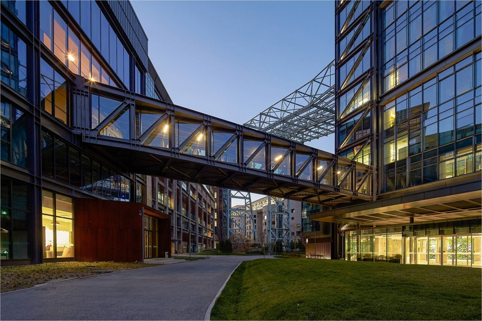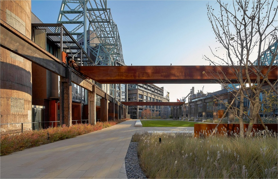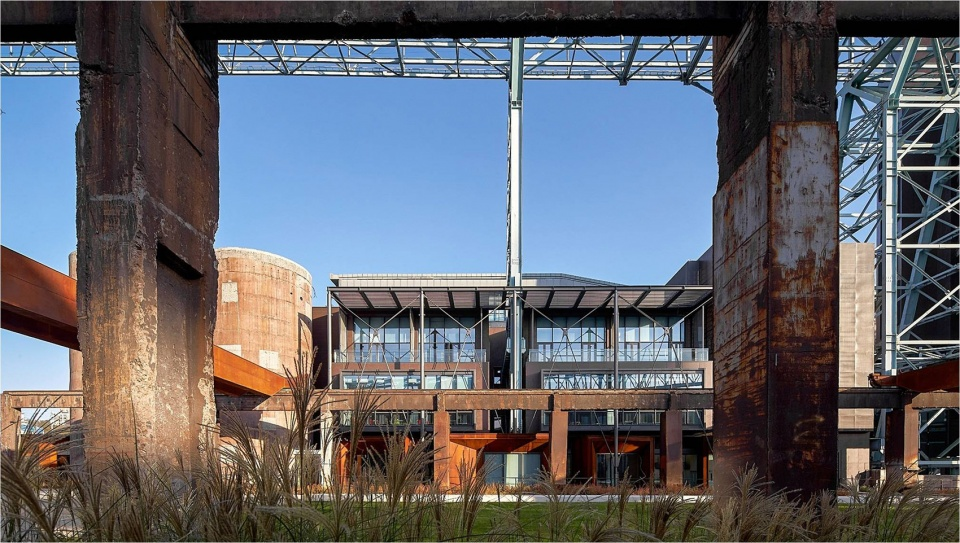 設計最大限度的展現(xiàn)了對原有建筑結(jié)構的“保留”和“加建”的理念,在表達對工業(yè)建筑尊重的同時,也凸顯出工業(yè)改造的獨特性。設計師還在封閉的建筑墻體內(nèi)植入開放式景觀廊道及公共空間,重組了園區(qū)內(nèi)外的對話關系。各種大尺度的工業(yè)建筑空間也被巧妙的進行了柔和與縫補,營造出了景色宜人、充滿活力院落。這些相得益彰的空間組合讓工業(yè)景觀也有了古典園林的精髓和美妙。