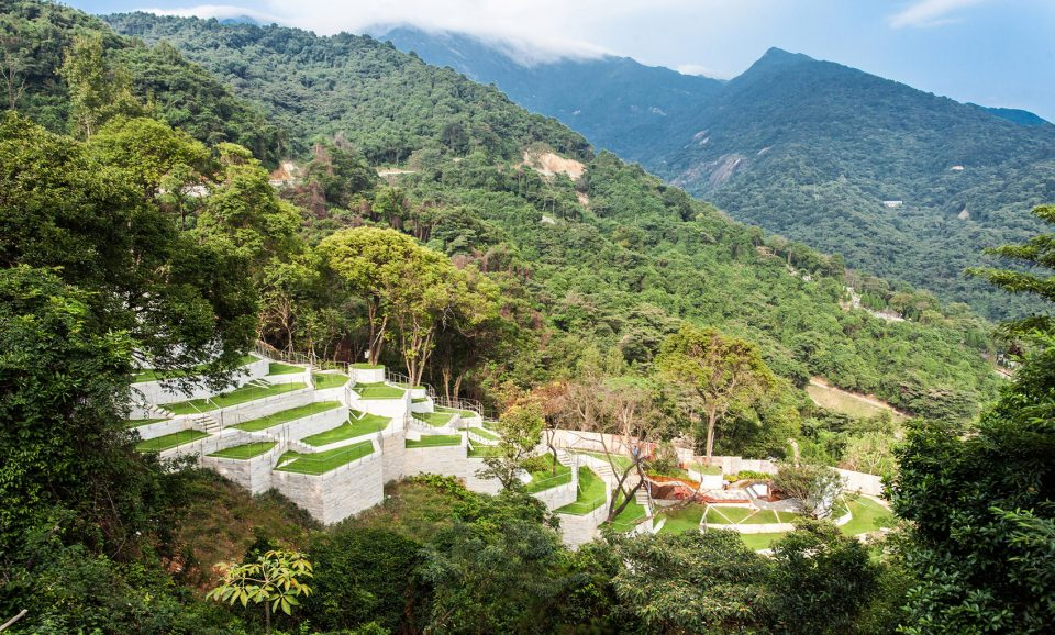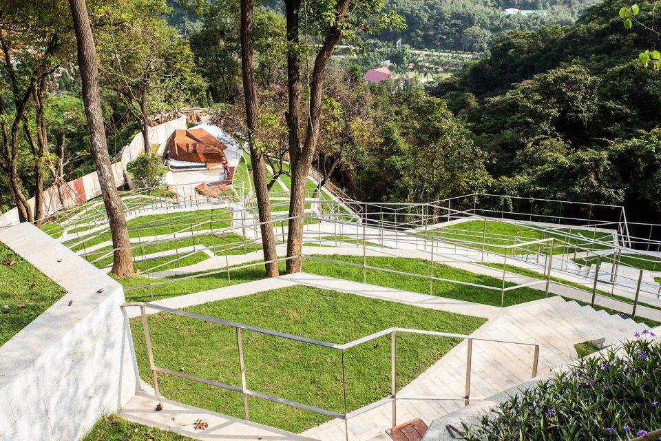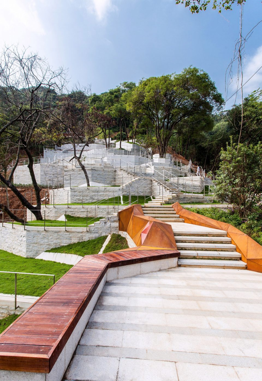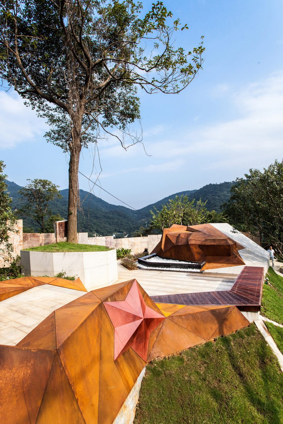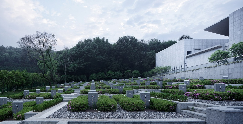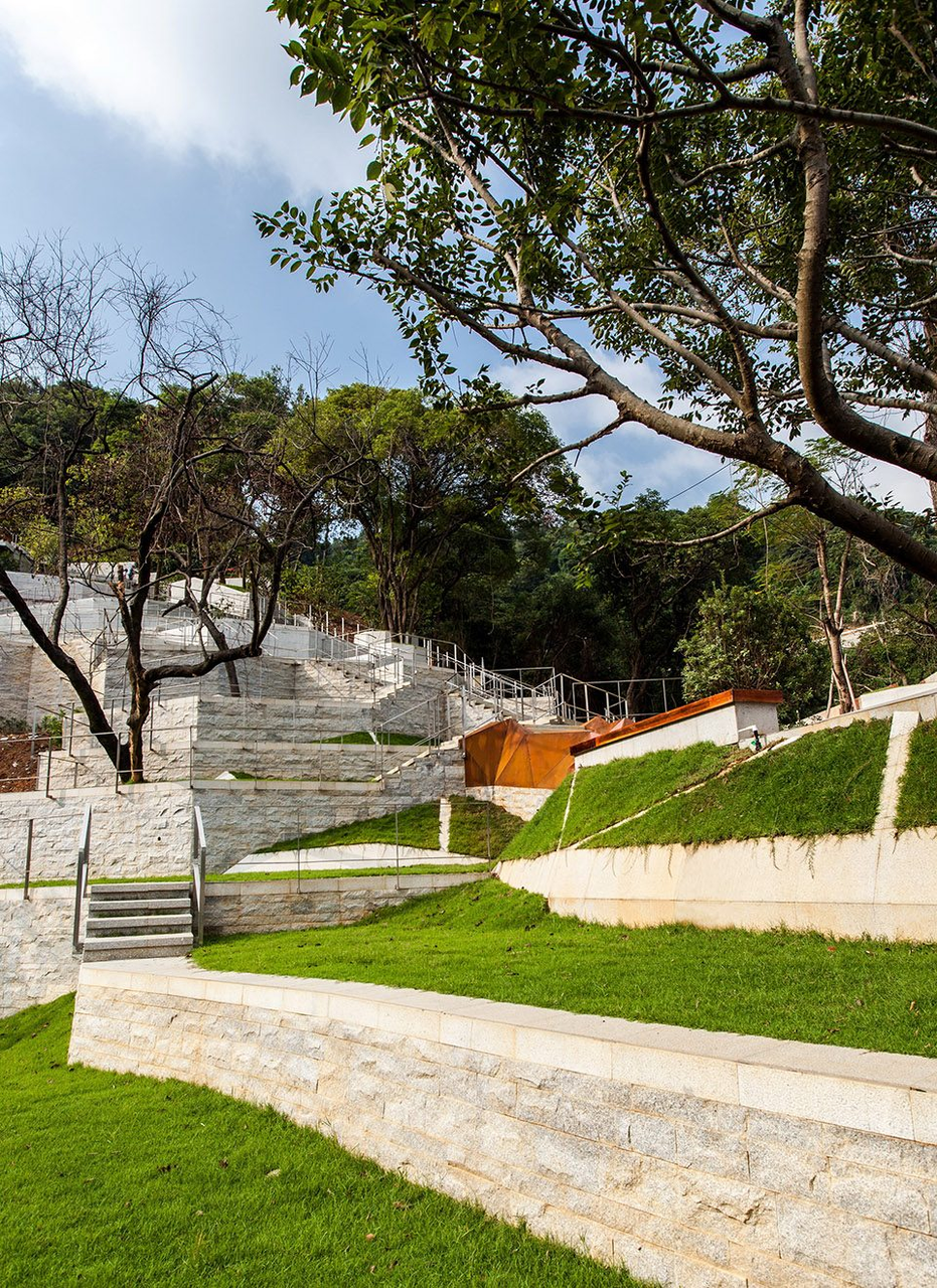 園區(qū)是為了紀念一位在崢嶸歲月里為國家建設而奮斗犧牲的基建工程兵,弘揚創(chuàng)新發(fā)展、攻堅克難的“拓荒?!本瘛_@座紀念墓園落成于廣東省惠州市的羅浮山,依山勢而建的折線梯田景觀勾勒出了墓園輪廓,以一種剛毅的力量感呼應著團結(jié)奉獻和鐵骨錚錚的士兵精神。