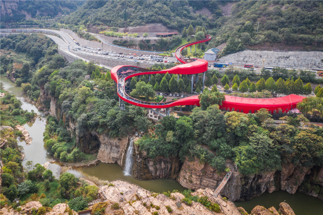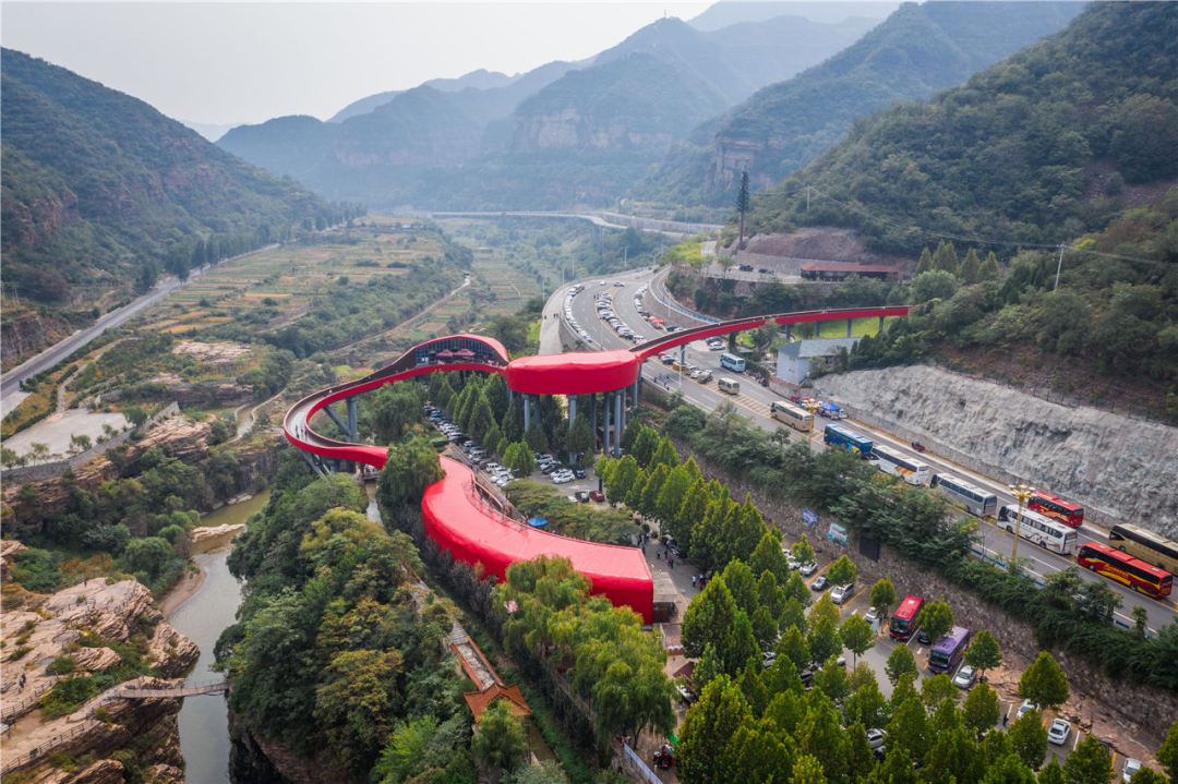 位于景區(qū)入口處的“太行天梯”,凌駕于景區(qū)停車場之上,跨過一條省級公路,與登山步道相連接。在對場地保持最少干預,和為游客提供舒適步行體驗的同時,又提供了接待、商業(yè)、餐飲、賞景等多種功能。鋼結(jié)構、金屬材料與木材的使用還保證了建筑材料最大限度回收利用的可能。