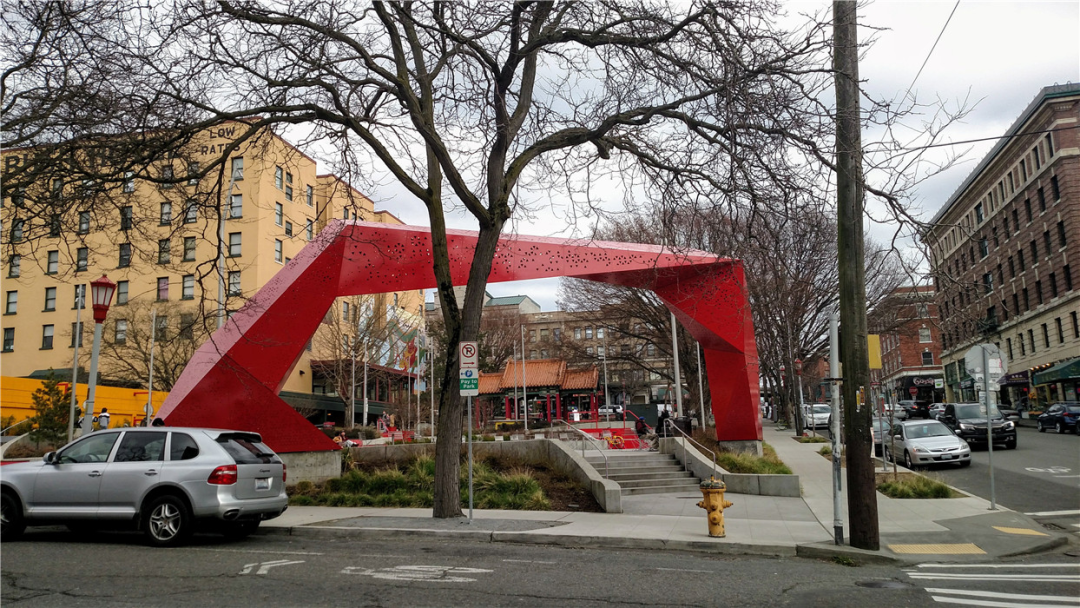 設計團隊歷經(jīng)一年的詳細設計,最終確定“城市戲臺”的設計方案,并于2016年正式開始施工建設。公園中融入了多種中國和東亞文化元素,以及社區(qū)的地方精神。整個場地以一個醒目的標志性紅色門框為焦點,以表征社區(qū)的亞裔文化特征。“戲臺”順應地形坡度,創(chuàng)造出一層層靈動的梯田式臺地,以及一個靈活的舞臺,還設有各種公共休息的平臺、健身設施和臨時性家具。這些特色的設計元素和在地的設計考慮深受社區(qū)民眾喜歡,成為了當?shù)刈罹呋盍Φ墓部臻g和目的地之一。