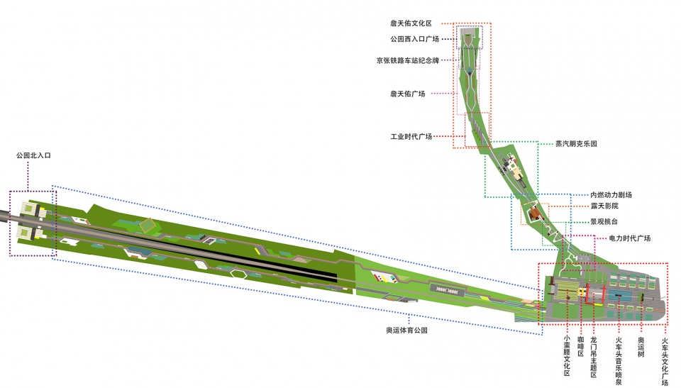設計注重勾陳歷史,煥新價值,營造有故事、有溫度,獨屬于這一地帶的公共空間。依據(jù)鐵道走向,公園呈人字型布局,分東西人文軸線與南北運動軸線兩大部分,其交匯處公園的核心——火車頭文化廣場。機車頭、龍門吊、機械臂、水塔等豐富的工業(yè)遺跡生動地向人們展示令人驕傲的火車工業(yè)史。