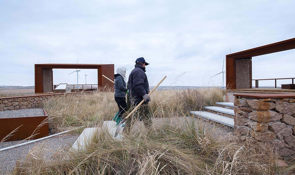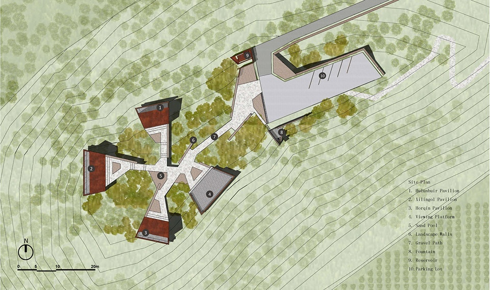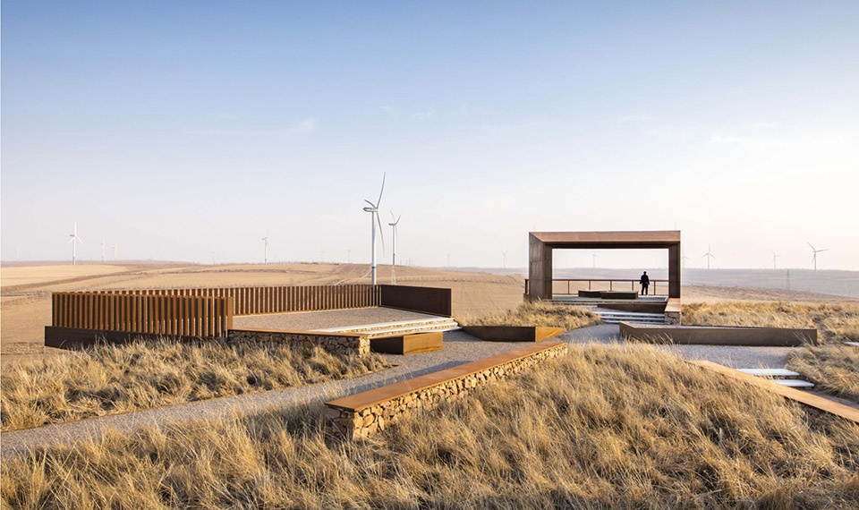 內(nèi)蒙古的敖包山頂公園是一座具有教育意義的場所,為紀念幾代人在我國西北荒漠化防治所付出的努力。從上世紀30年代的漫山黃沙,到如今的生機盎然,敖包山公園所在的地方見證了荒漠化治理的卓越功績,最具代表性。簡潔框架形式的觀景平臺將人們的目光引向三個不同的方向,代表著三個具有歷史意義的荒漠化治理區(qū),借助增強現(xiàn)實向人們講述了這一值得銘記的變革故事。