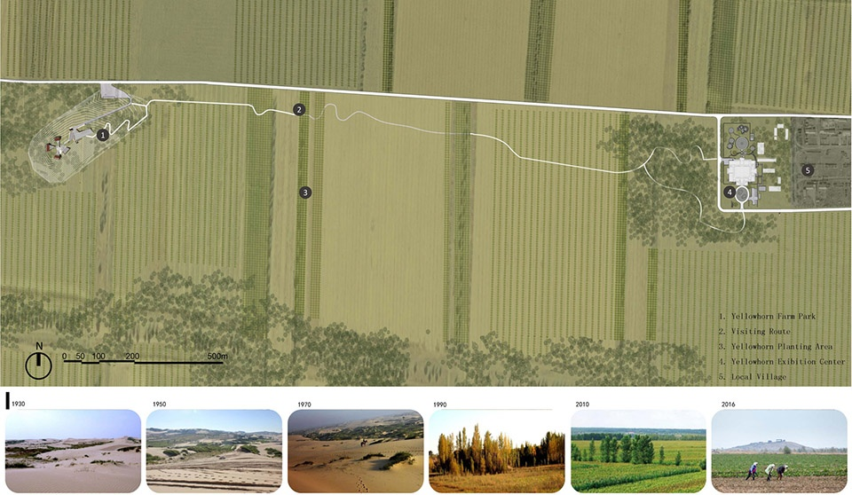 當?shù)胤N植的文冠果的枝葉結(jié)構為設計師帶來了設計靈感。為塑造高度適應性景觀,設計師采用傳統(tǒng)方法、當?shù)夭牧稀⒈就林脖?,在村民的自主參與下搭建和營造了多種用途的公園景觀。此外,公園周邊農(nóng)田與風力發(fā)電相結(jié)合,為當?shù)靥峁┛稍偕茉?。公園的建造不僅象征著防治荒漠化的歷史,還為當?shù)貛砩鷳B(tài)、休閑、教育和經(jīng)濟等多方面的利益。