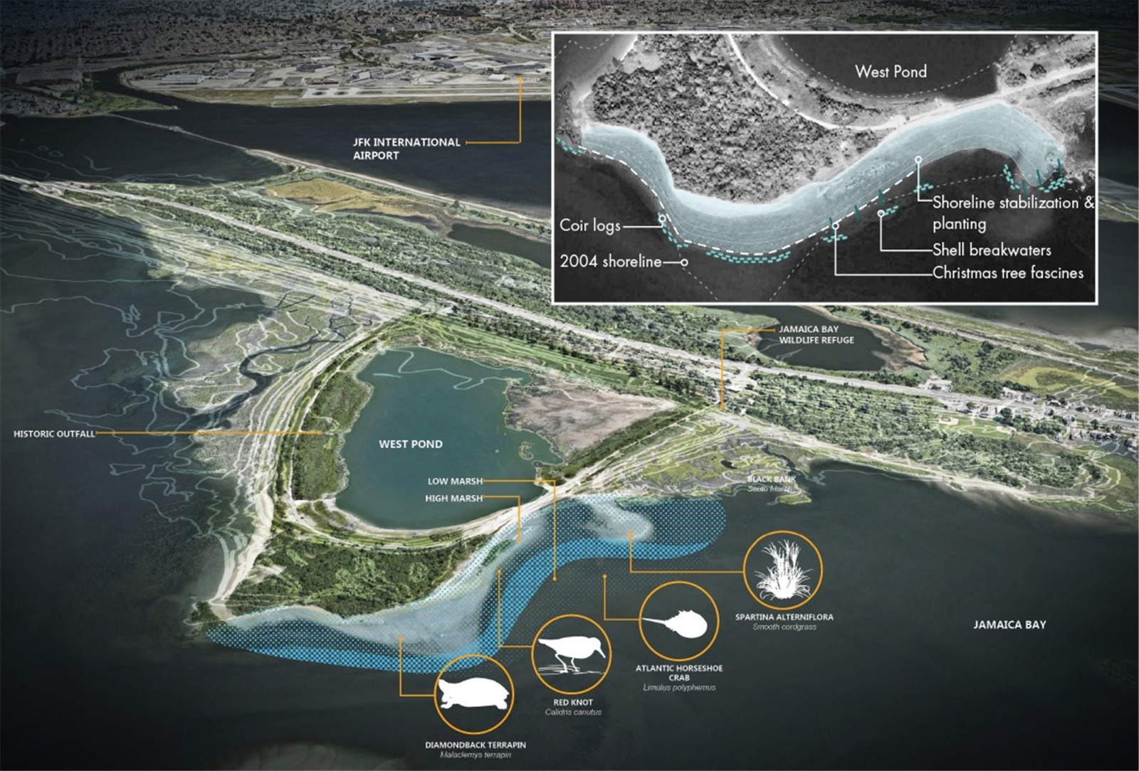 2012年,颶風(fēng)“桑迪”襲擊了位于蓋特威國(guó)家公園(Gateway National Park)內(nèi)占地面積約18公頃的關(guān)鍵淡水濕地,即西部湖區(qū)(West Pond)。這片區(qū)域是大西洋遷徙鳥(niǎo)類的重要棲息地,也是牙買加灣濕地生態(tài)系統(tǒng)的一部分。值得注意的是,這片寶貴的自然資源距離曼哈頓的密集市區(qū)僅有19公里。