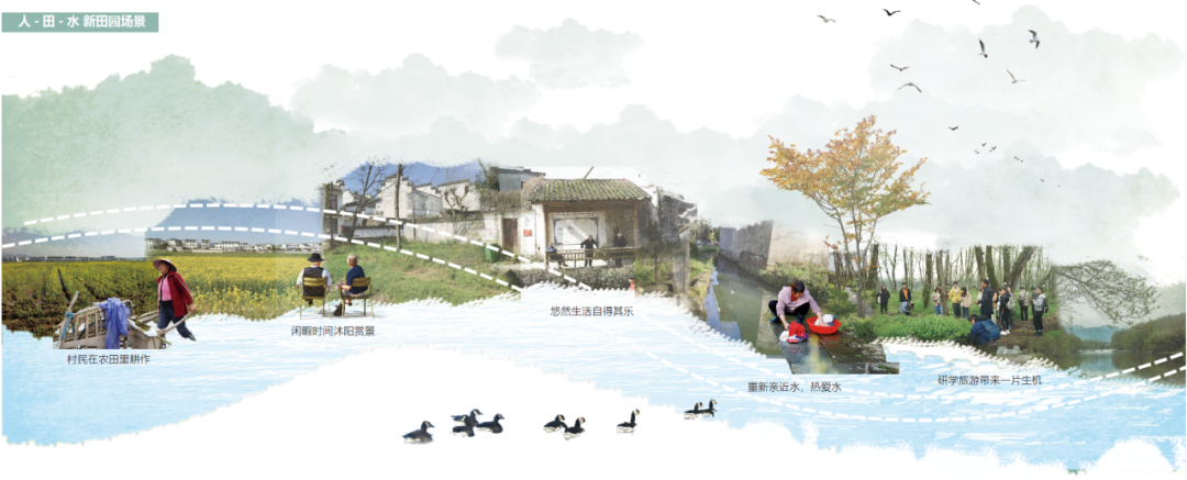 通過(guò)對(duì)場(chǎng)地生態(tài)系統(tǒng)服務(wù)功能的恢復(fù),形成田-水-人-村共生共存的當(dāng)代新田園,人們?cè)谶@種新的海綿田園視野下,享受鄉(xiāng)村帶來(lái)的放松身心、教育體驗(yàn)、健康調(diào)節(jié)等各類(lèi)服務(wù),同時(shí)增加鄉(xiāng)村的經(jīng)濟(jì)收益,積極發(fā)展農(nóng)業(yè)與旅游業(yè)的互利共贏。