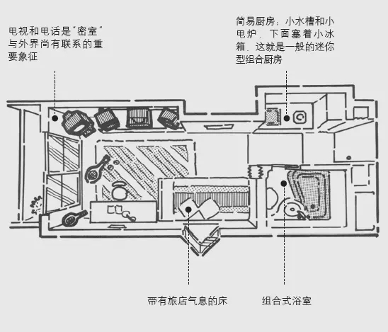 從來沒有完全獨創(chuàng)的空間發(fā)明。一般都是有一個現(xiàn)有的空間模型,我們將它的用途改變一下,就稱之為空間發(fā)明了。例如,人們以羅馬的大浴場為原型發(fā)明了近代大規(guī)模的驛館空間?!皢紊砉ⅰ钡脑蛣t是旅館的客房,而且是商務(wù)旅館的單間。進門后先是狹窄的過道,過道一旁設(shè)有浴室、廁所一體化的組合浴室,過道的盡頭是一間六疊大小的房間[single room]。這與商務(wù)旅館的單間設(shè)計幾乎是一樣的。更有意思的是,“單身公寓”的空間并不僅僅是以旅館客房為原型,它還以各種方式突出強調(diào)其與旅館客房的相似之處。比如對組合浴室的