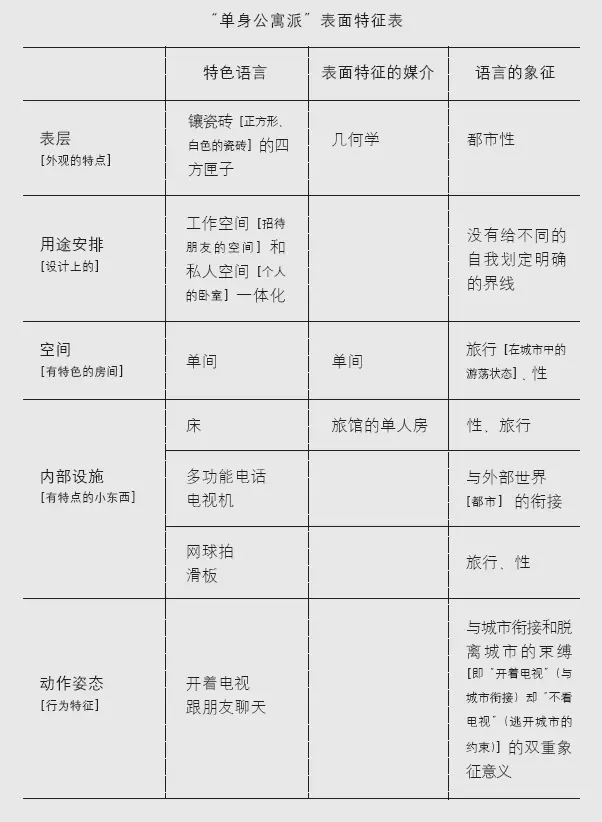 “單身公寓”的室內(nèi)陳設(shè),也大體仿照旅館的空間原型?;驹O(shè)施有床、電話、電視機和簡易桌。床是性的重要象征本體,而且視覺上也占了很大空間,因此床的擺放位置和設(shè)計構(gòu)思[不只是床體,還包括床罩]需要給予相當(dāng)?shù)闹匾?。即使是為了?jié)約空間,也不能不用床而