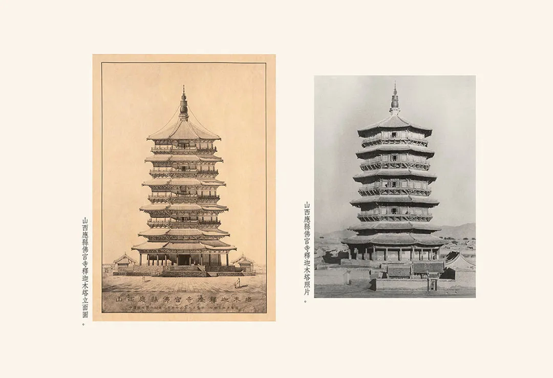 ▲左邊是梁思成和莫宗江手繪的立面圖,右邊是木塔的照片
