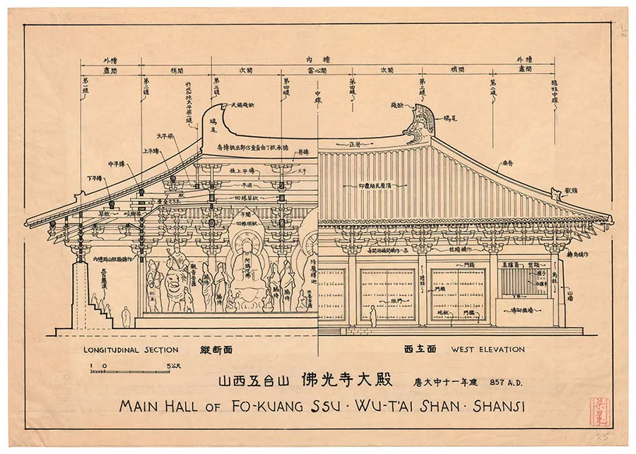 還有山西五臺山的佛光寺大殿。1937年夏天,梁思成、林徽因、莫宗江等人在這里花上了數(shù)天的時間,里里外外爬上爬下對東大殿進(jìn)行了考察。判斷出寺院最高處的東大殿,是公元857年(唐)修建。從此打破日本學(xué)者“中國境內(nèi)已無唐代木制建筑”的斷言。