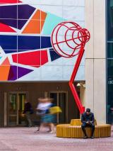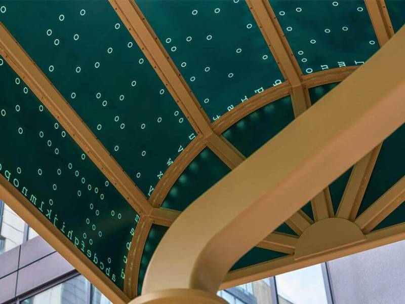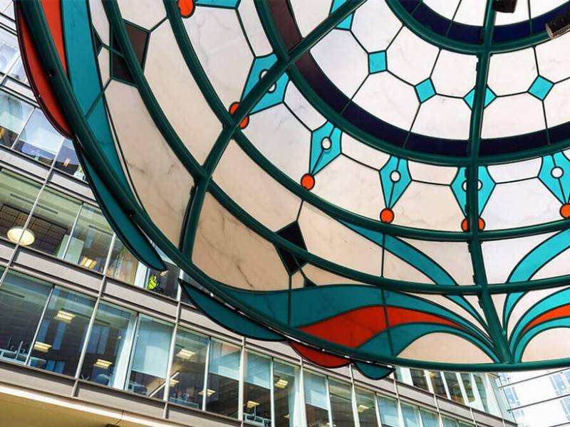以下是每個(gè)燈泡代表的內(nèi)容:創(chuàng)新與教育:1903年新藝術(shù)風(fēng)格蒂凡尼燈:向曼徹斯特的教育歷史致敬,包括該市的Chetham圖書(shū)館,該圖書(shū)館擁有英國(guó)最古老的免費(fèi)公共參考圖書(shū)館。雕塑的天蓬裝飾著開(kāi)放的書(shū)籍,旁邊還有經(jīng)典的筆尖和方形的學(xué)院帽。