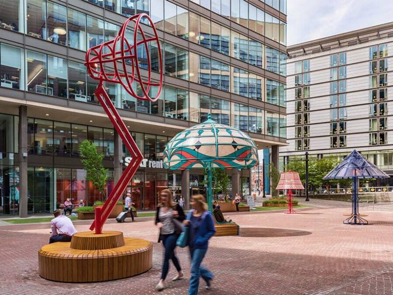 未來(lái),創(chuàng)新和創(chuàng)造力:標(biāo)志性的角度燈,向上投射圖形圖案到周圍的墻壁,旨在代表城市的未來(lái)和下一章。它為未來(lái)的可能性提供了一個(gè)亮點(diǎn),不僅對(duì)曼徹斯特人民而且對(duì)整個(gè)世界的社區(qū)都是如此。傾斜光線的軸與周圍建筑和城市環(huán)境的角度相互作用。