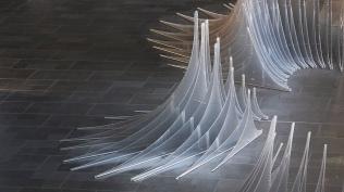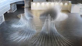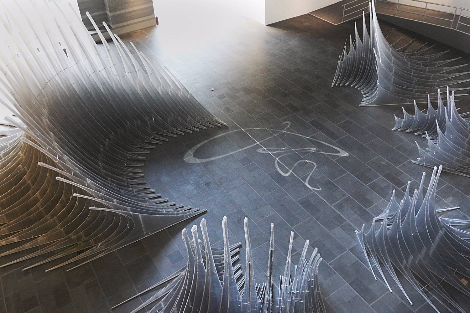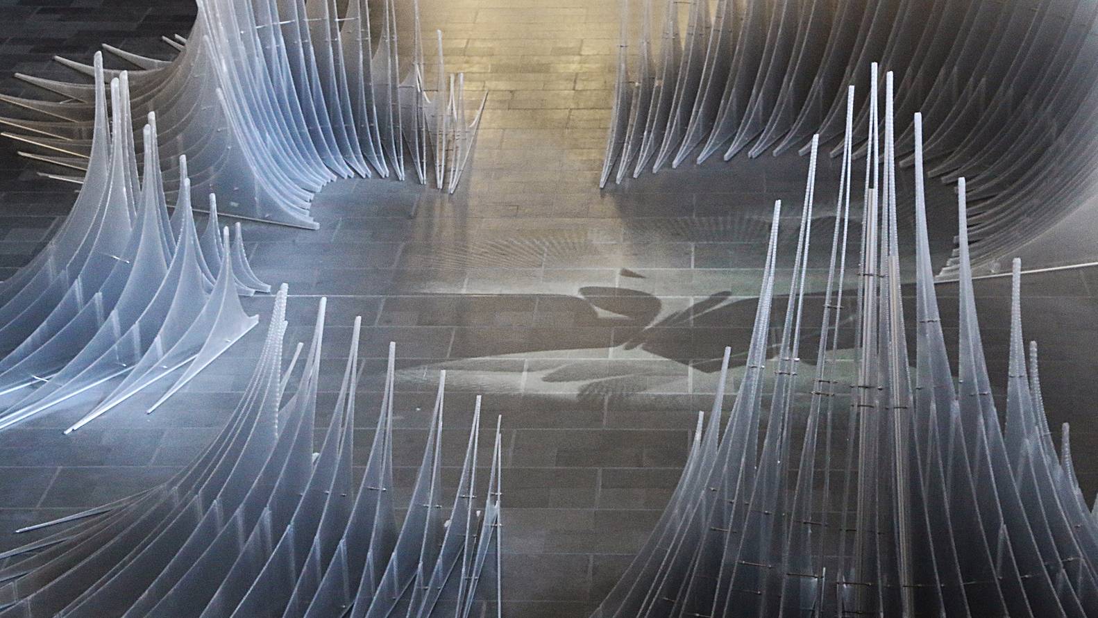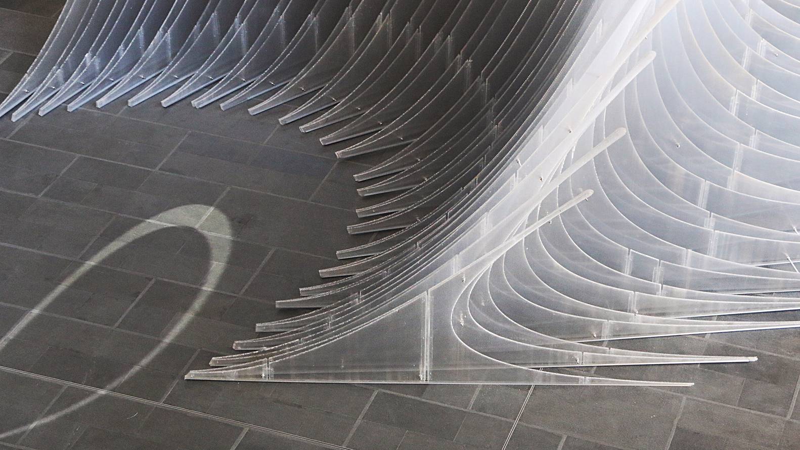 最終,半透明的材質(zhì)通過(guò)不同的疊合方式,在日光及燈光下呈現(xiàn)出不同的透明度,實(shí)現(xiàn)美觀效果的同時(shí),更貼合了書(shū)法中墨分五色的特點(diǎn)。與此同時(shí),空間裝置的整體設(shè)計(jì)思路被制作成視頻,投影在場(chǎng)地中央,與裝置結(jié)合為一體。內(nèi)容從最開(kāi)始的毛筆字,到曲線和曲率分析,交互功能的參與讓空間變得更加豐富有趣。