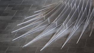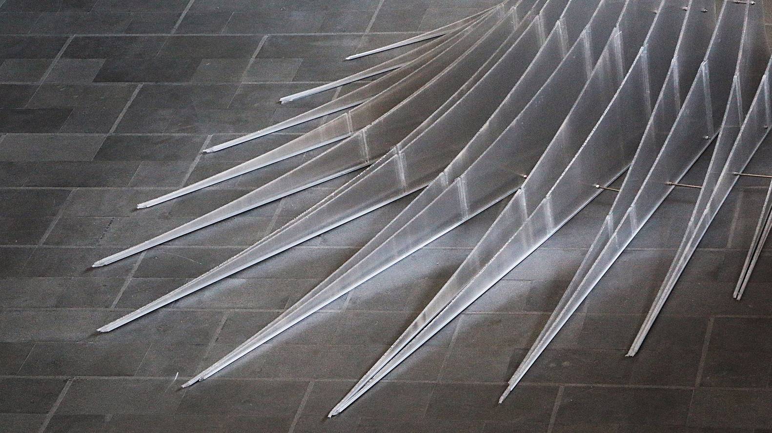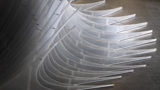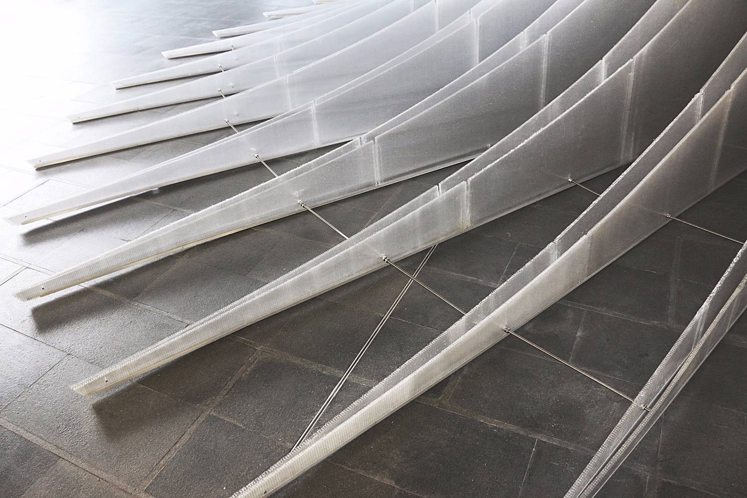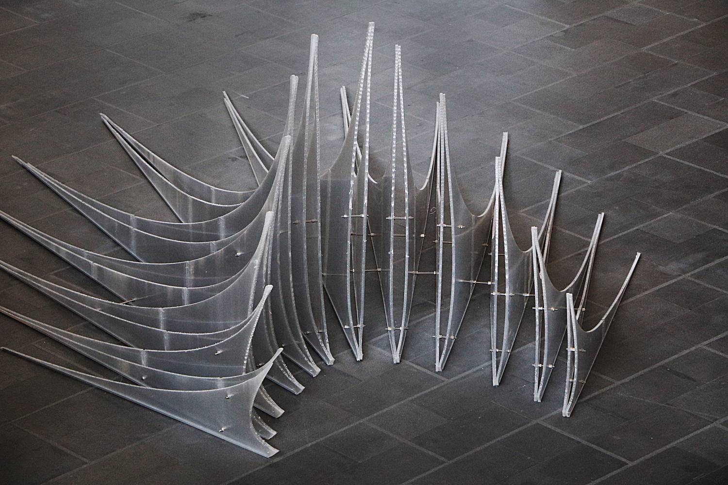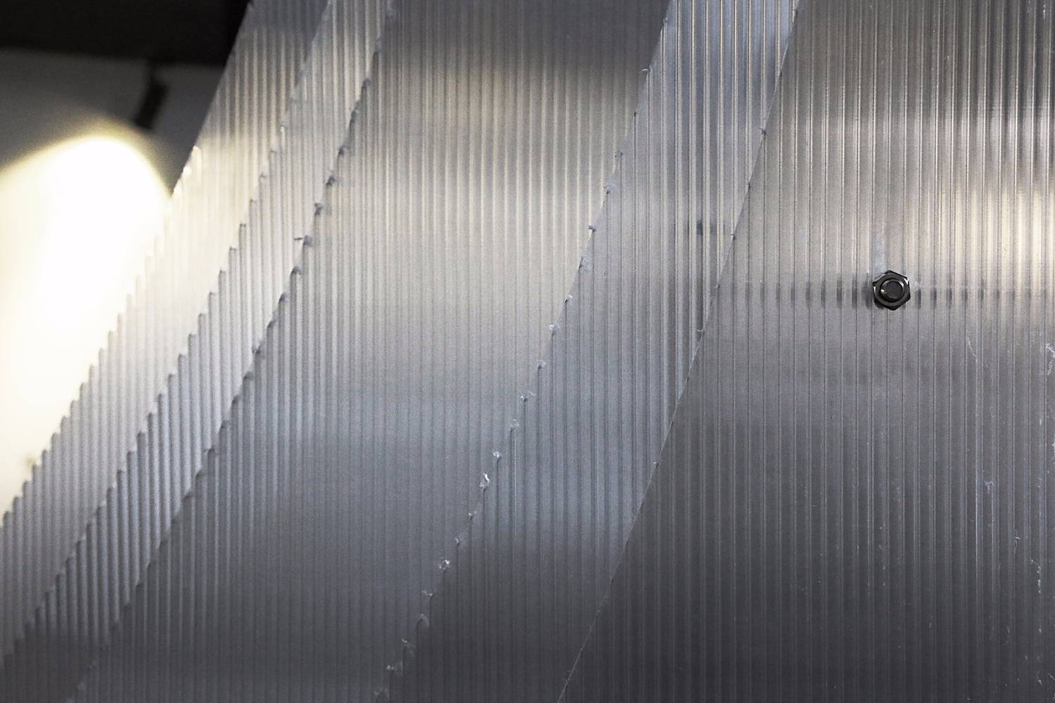 因應(yīng)項(xiàng)目場(chǎng)地大,預(yù)算低,且工期緊張等諸多限制,裝置最終選擇以廉價(jià)的陽(yáng)光板為主要搭建材料。每?jī)蓧K之間使用鐵桿連接組成人字形,因此能獨(dú)立放置于地面而無(wú)需釘子或膠水固定。最后整組拼合成最終形態(tài)。空間裝置使用參數(shù)化方法設(shè)計(jì),每塊板件的形狀都是獨(dú)一無(wú)二的并擁有獨(dú)自的編號(hào),通過(guò)數(shù)控機(jī)床切割而成。同時(shí)考慮到裝置安裝的便利和工人對(duì)圖紙的理解能力,安裝圖紙有別于傳統(tǒng)的施工圖紙,更像是家具拼裝圖。