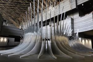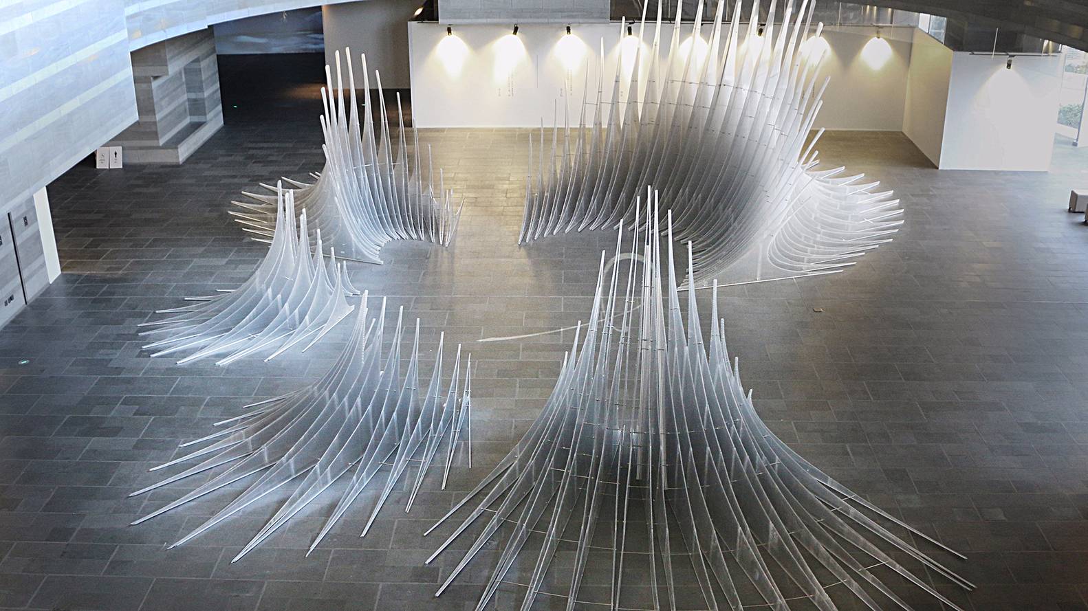 “合”是配合以弘揚(yáng)中國(guó)傳統(tǒng)書(shū)畫(huà)藝術(shù)為主題的《筆尖指尖藝術(shù)展》而設(shè)計(jì)建造的空間裝置。項(xiàng)目位于上海虹橋天地演藝中心展覽場(chǎng)地入口處的中庭,立體裝置配合投影與觀眾互動(dòng),將書(shū)法的精髓以三維的直觀印象傳達(dá)給即將進(jìn)入展廳的觀眾,使得展覽更具藝術(shù)性、知識(shí)性、觀賞性和互動(dòng)性。