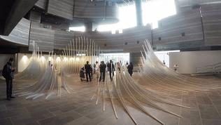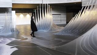 設(shè)計(jì)師與著名書(shū)法家王冬齡合作,以后者的書(shū)法作品作為素材,嘗試建立一套設(shè)計(jì)語(yǔ)言,把平面的書(shū)法藝術(shù)轉(zhuǎn)化為可以與身體互動(dòng)的詩(shī)意三維空間。