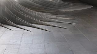 基于這樣的想法,設(shè)計(jì)者決定將書(shū)法還原成毛筆的運(yùn)動(dòng)軌跡,原始的線條。曲率作為線條中最重要的信息之一被提取出來(lái)。為配合《兩尖藝術(shù)展》的主題“天人合一”,裝置設(shè)計(jì)取王冬齡老師所書(shū)寫(xiě)的“合”字作為空間裝置的出發(fā)點(diǎn),在電腦里重現(xiàn)它的筆觸運(yùn)動(dòng)軌跡,得出曲線上各個(gè)點(diǎn)的切線方向角對(duì)弧長(zhǎng)的轉(zhuǎn)動(dòng)率,生成“合”的曲率分析圖。最后將二維平面的數(shù)據(jù)轉(zhuǎn)換為三維立體的空間,把書(shū)法的美感與韻律以一種量化的,直觀的方式傳達(dá)給觀眾。