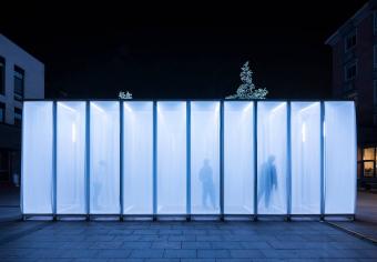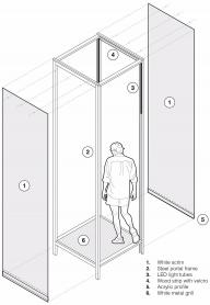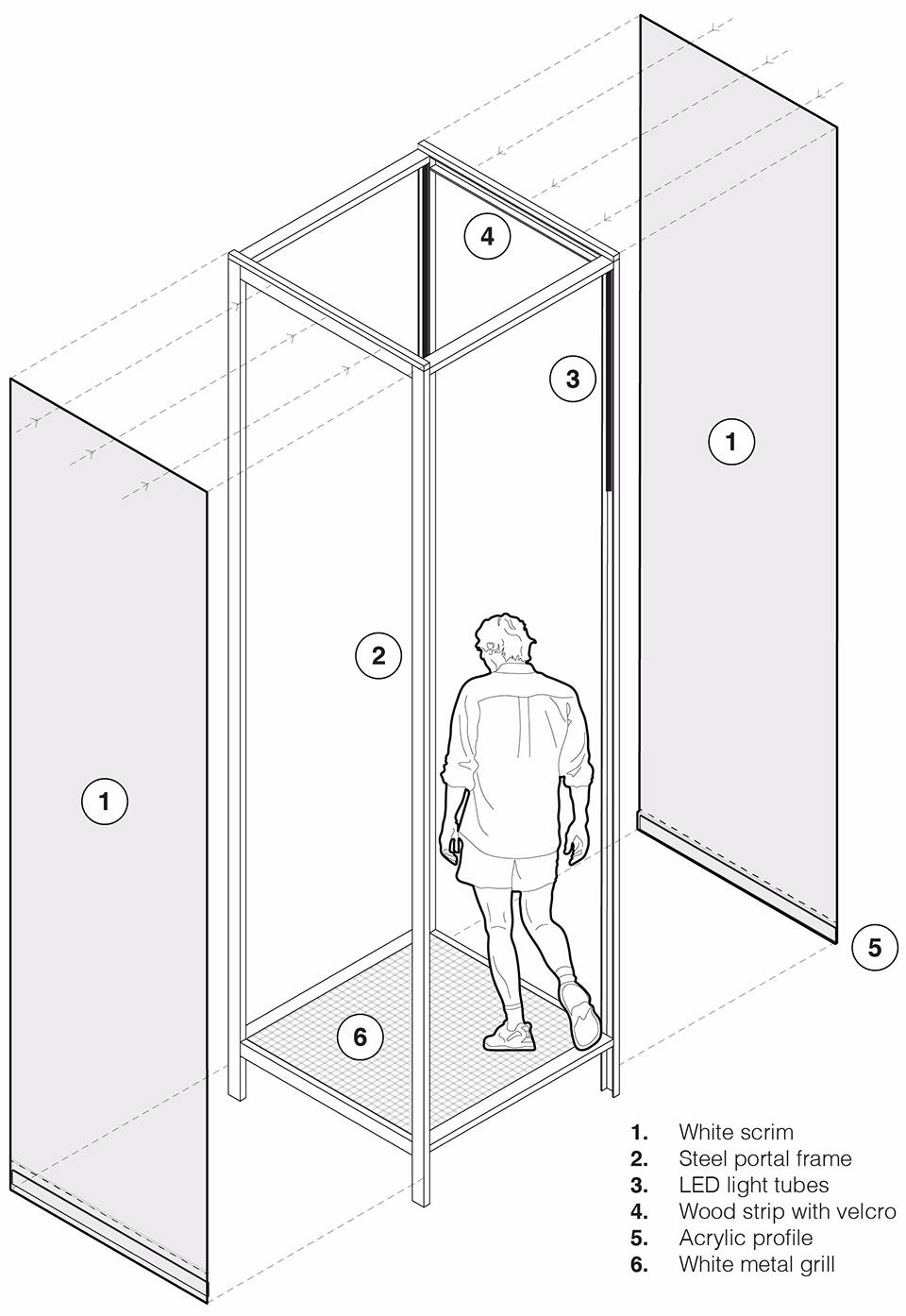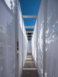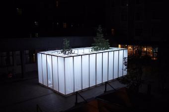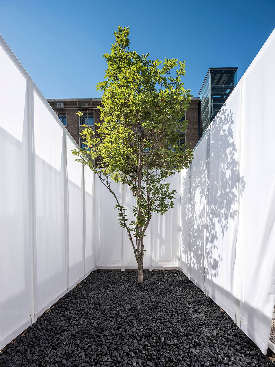 CO·貳是一個由光和煙霧組成的裝置,像棱鏡一般位于庭院的中心,加強并改善庭院對稱的比例。它由二十六個方形型材組成,使用簡單的螺栓和螺母連接在一個由3個不同的模塊組成的系統(tǒng)中,在庭院中心圍合成一個向天空開放的天井。在這里,游客在策略性安排下與庭院親密接觸,而四周的白色幕布則成為混亂的城市環(huán)境和庭院私密氛圍之間的過渡區(qū)域。