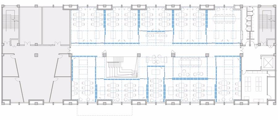 本項(xiàng)目位于多層廠房的一層和二層,進(jìn)深達(dá)24米,層高只有3.6米。作為眾創(chuàng)空間原建筑采光通風(fēng)先天不足,設(shè)計(jì)先從采光和通風(fēng)的分析入手。