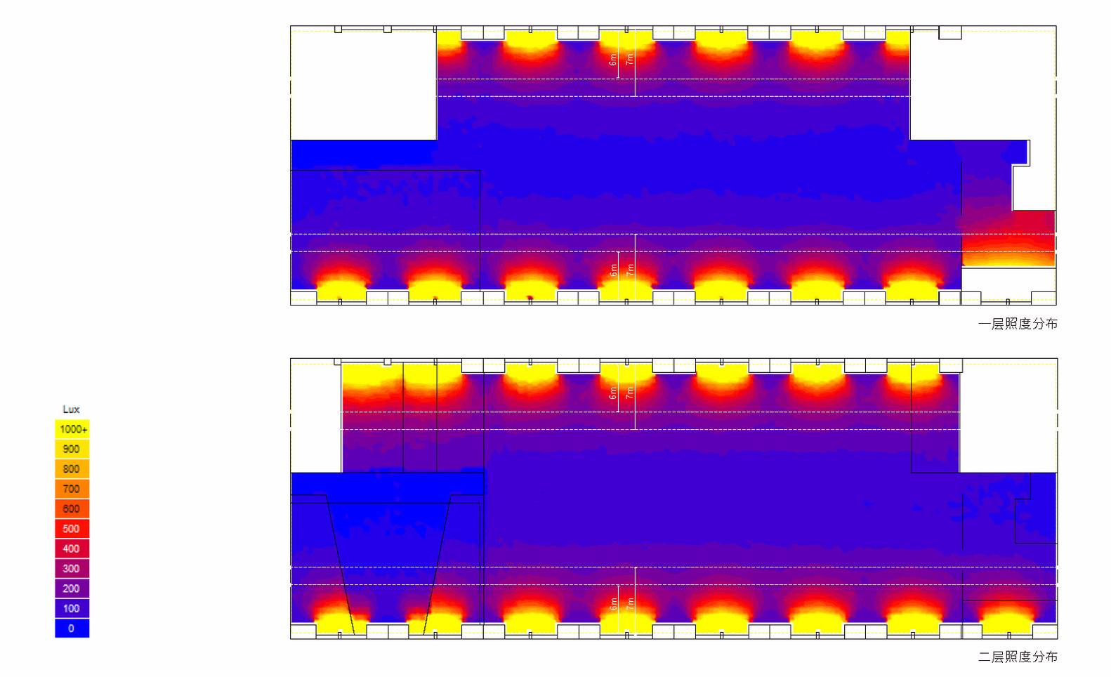從自然采光分析可以得出,距外墻窗6-7米的范圍能夠達(dá)到辦公空間的自然采光標(biāo)準(zhǔn),可作為辦公用;中部的自然采光不足,需補(bǔ)充人工照明,可作為交通空間以及共享空間用。