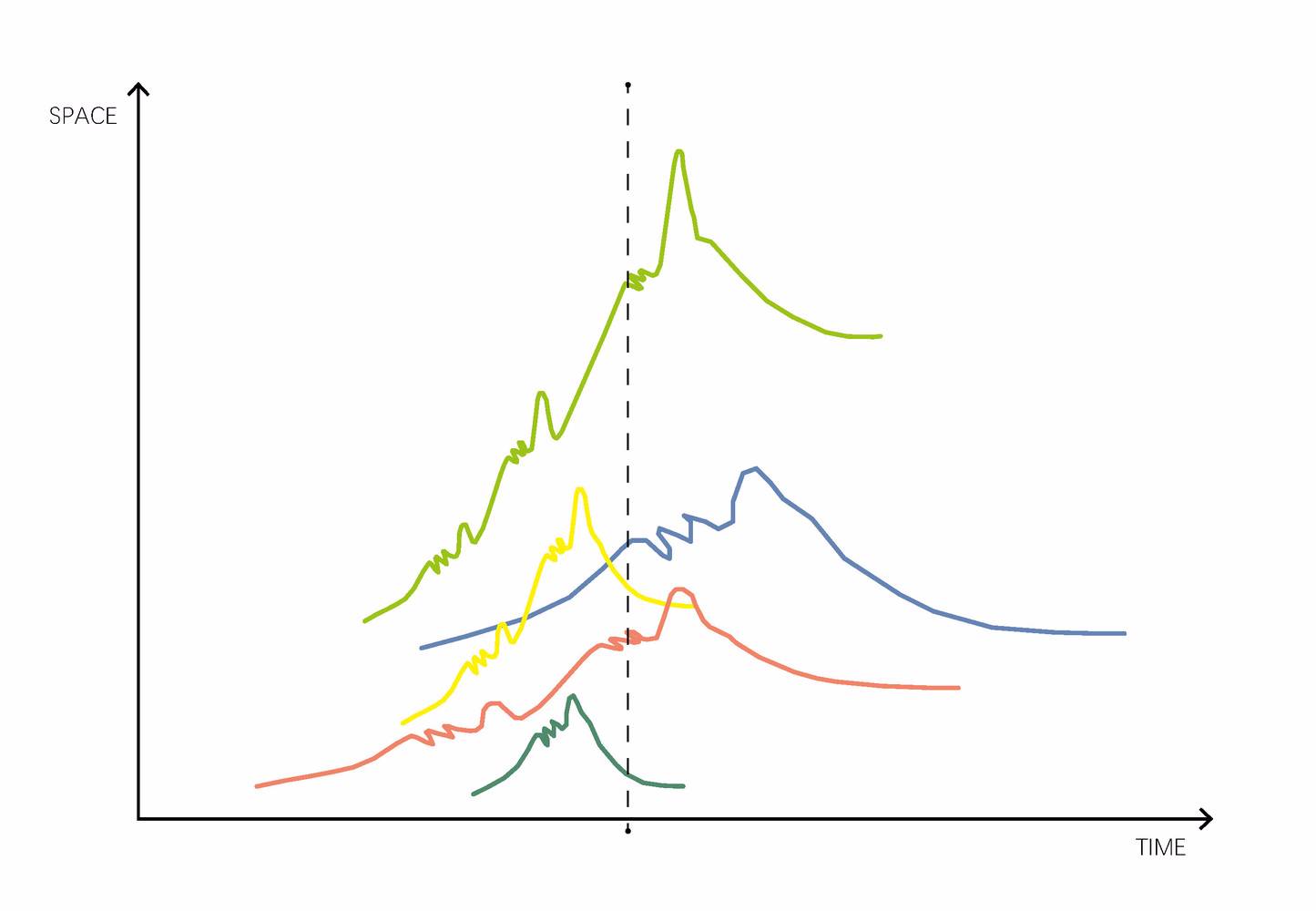 從生命周期的角度觀察一個(gè)團(tuán)隊(duì),其規(guī)模的發(fā)展軌跡在時(shí)間軸上呈正態(tài)分布。共享一個(gè)大空間的不同團(tuán)隊(duì)在時(shí)間軸上的某一點(diǎn)的發(fā)展程度也是不一樣的,因此就存在各個(gè)團(tuán)隊(duì)的各個(gè)正態(tài)曲線在同一時(shí)間點(diǎn)疊加的情況。隨著時(shí)間軸的移動(dòng),各個(gè)團(tuán)隊(duì)的規(guī)模都在發(fā)生變化,而團(tuán)隊(duì)的規(guī)模在空間上的表現(xiàn)就是空間的大小,這就意味著——在整個(gè)空間中,空間的部分與部分之間的界面必須是動(dòng)態(tài)的,而不是靜態(tài)的。