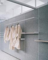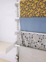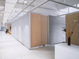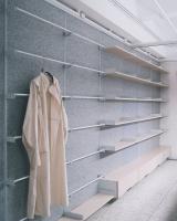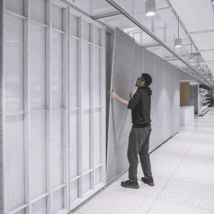 可移動(dòng)的多功能隔斷頂部有吊輪,可在頂部模數(shù)化的網(wǎng)格軌道內(nèi)自由滑動(dòng),以滿足各種空間的組合需求。隔斷以鋼框架為結(jié)構(gòu),面板可自由替換,可以是毛氈、陽(yáng)光板、木板或其它材質(zhì)的面板。鋼框的兩側(cè)有兩條AA柱,可將多功能的組件固定在AA柱上,這些組件有書(shū)架板、不同高度和深度的抽屜、桌面、掛衣架、布簾架、磁性白板、臺(tái)燈夾等。這些組件和面板可根據(jù)使用需求自由組合,還可不斷擴(kuò)充,滿足各團(tuán)隊(duì)的使用功能。