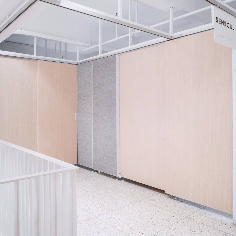 為了保證隔斷具有通用性,所有的隔斷的尺寸是一致的。由于隔斷與隔斷之間以及隔斷與建筑之間需要解決一些非模數(shù)的尺寸,因此設(shè)計(jì)了一對(duì)可重疊的移門(mén)來(lái)消化這些尺寸。這對(duì)可重疊的移門(mén)既可以作為各部分的門(mén)來(lái)用,也可以作為兩個(gè)空間的分隔。