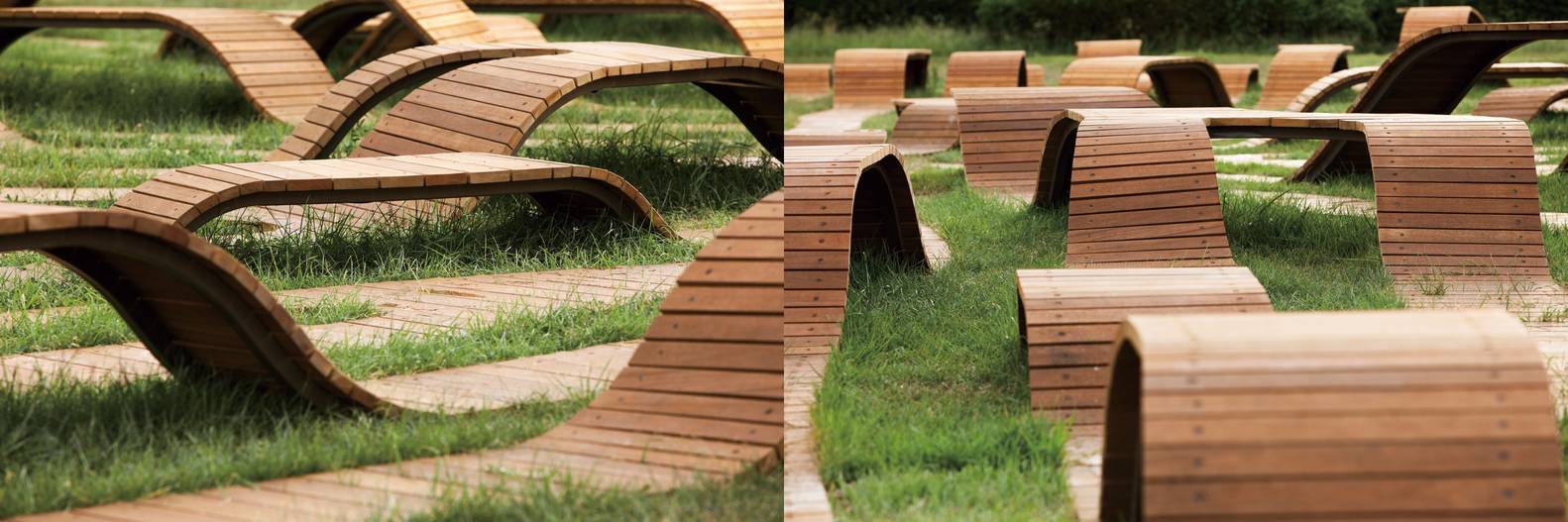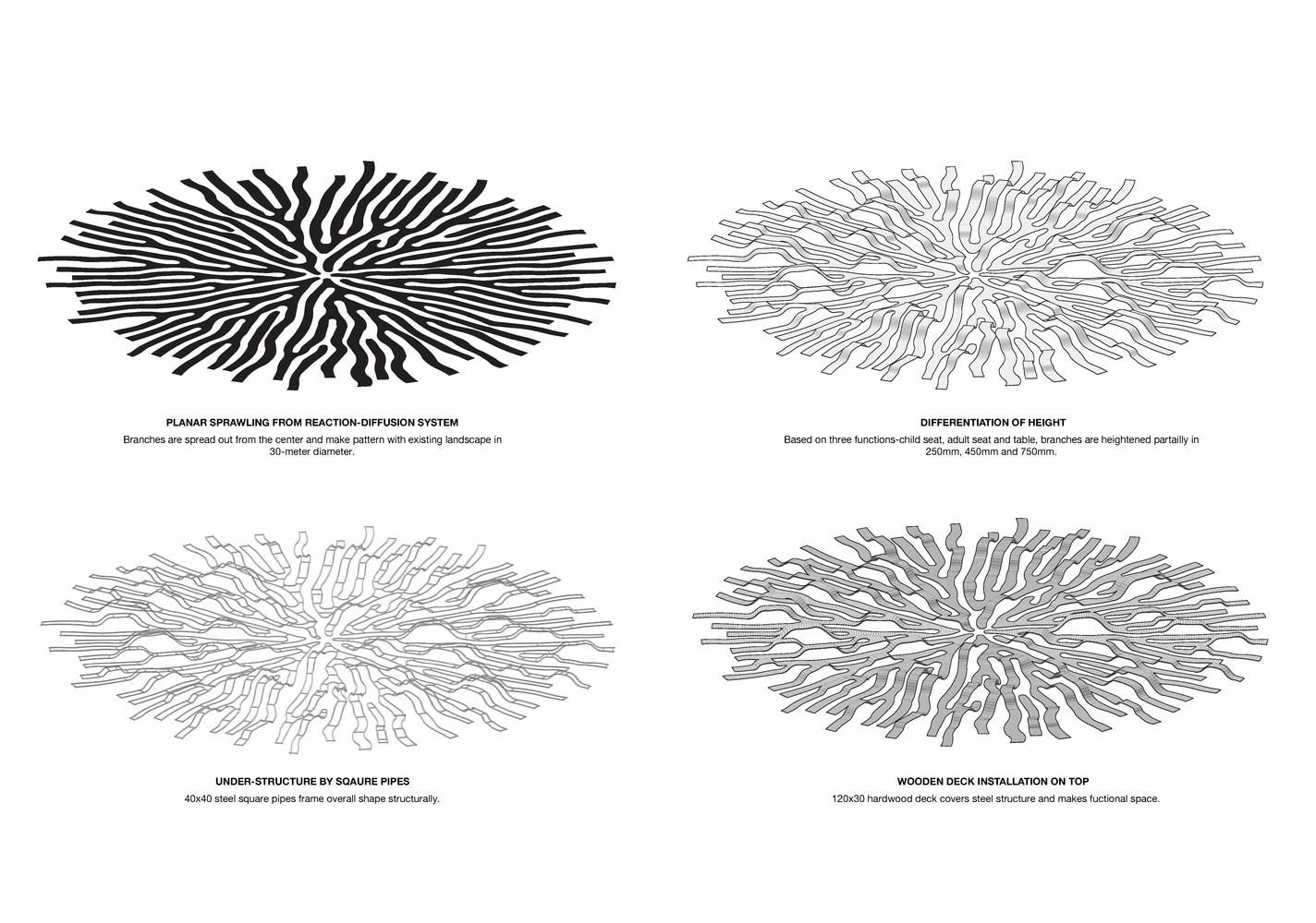 計(jì)算機(jī)算法設(shè)計(jì)的藝術(shù)品從三維幾何的角度呈現(xiàn)動(dòng)態(tài)性。金屬框架與混凝土基礎(chǔ)作為主要結(jié)構(gòu)支撐整體形式,并用木板覆蓋它。通過(guò)應(yīng)用熟悉的材料,使它成為易于使用和維護(hù)的舒適的座椅。長(zhǎng)凳與草融為一體,使人工安裝與自然環(huán)境的界限模糊,同時(shí)也呈現(xiàn)出完整的圓形。在相互交流的同時(shí),游客可以在休息的空間中感到舒適,同時(shí)欣賞藝術(shù)品。它還可以完美地作為三種不同高度的家具:兒童椅(250mm)、成人椅(450mm)和桌子(750mm)。這種有節(jié)奏的形狀可以給漢江藝術(shù)公園帶來(lái)新鮮的刺激,并提供多樣的樂(lè)趣。